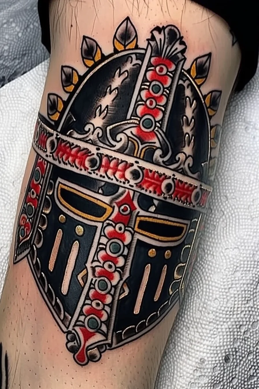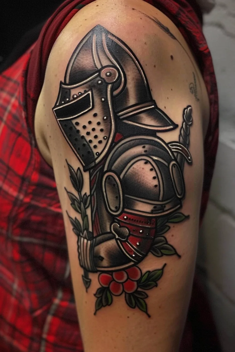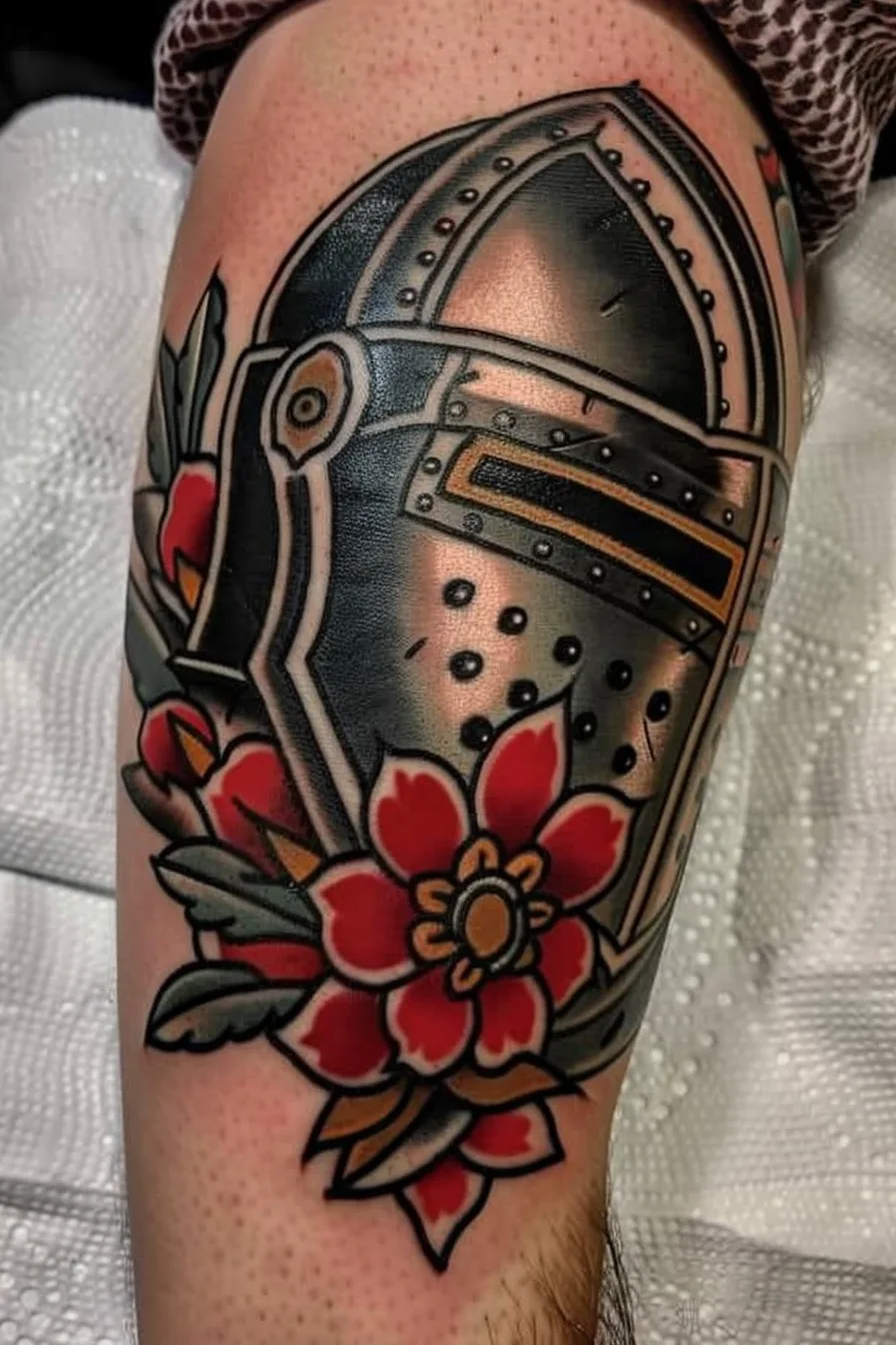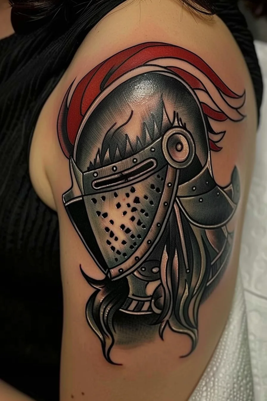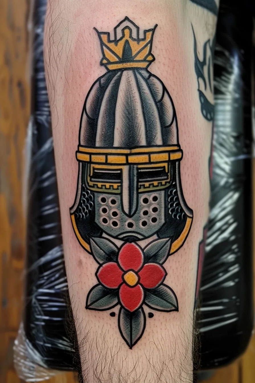 Whether you're considering a full-sleeve battle scene or a simple helmet silhouette, there's a knight tattoo to suit your style.