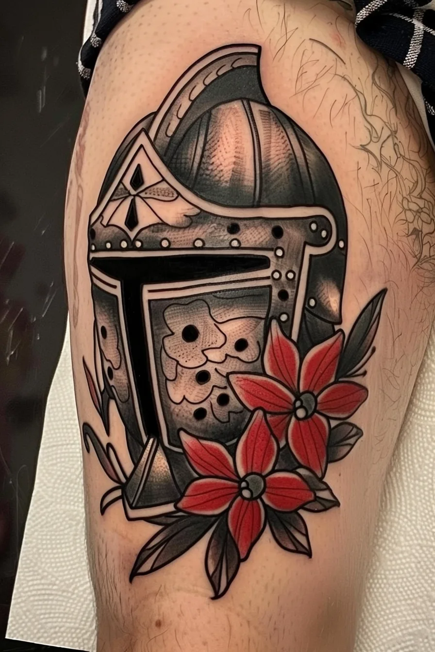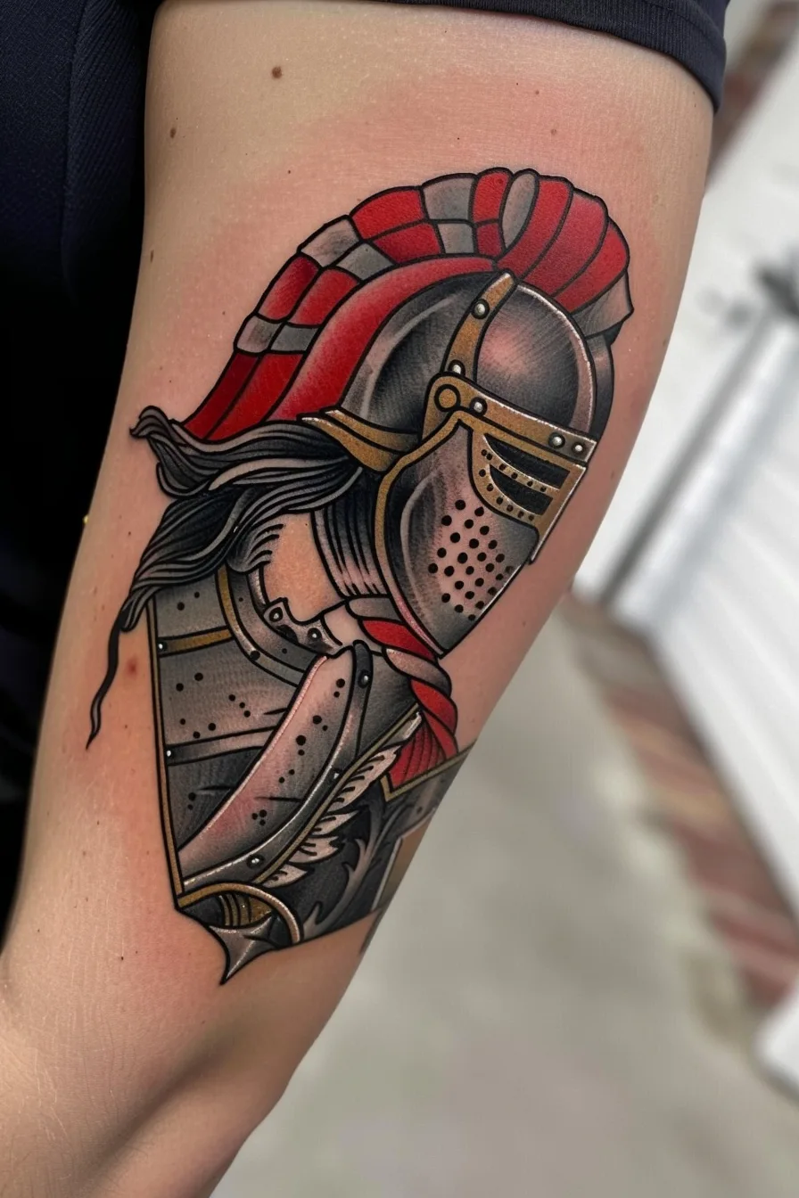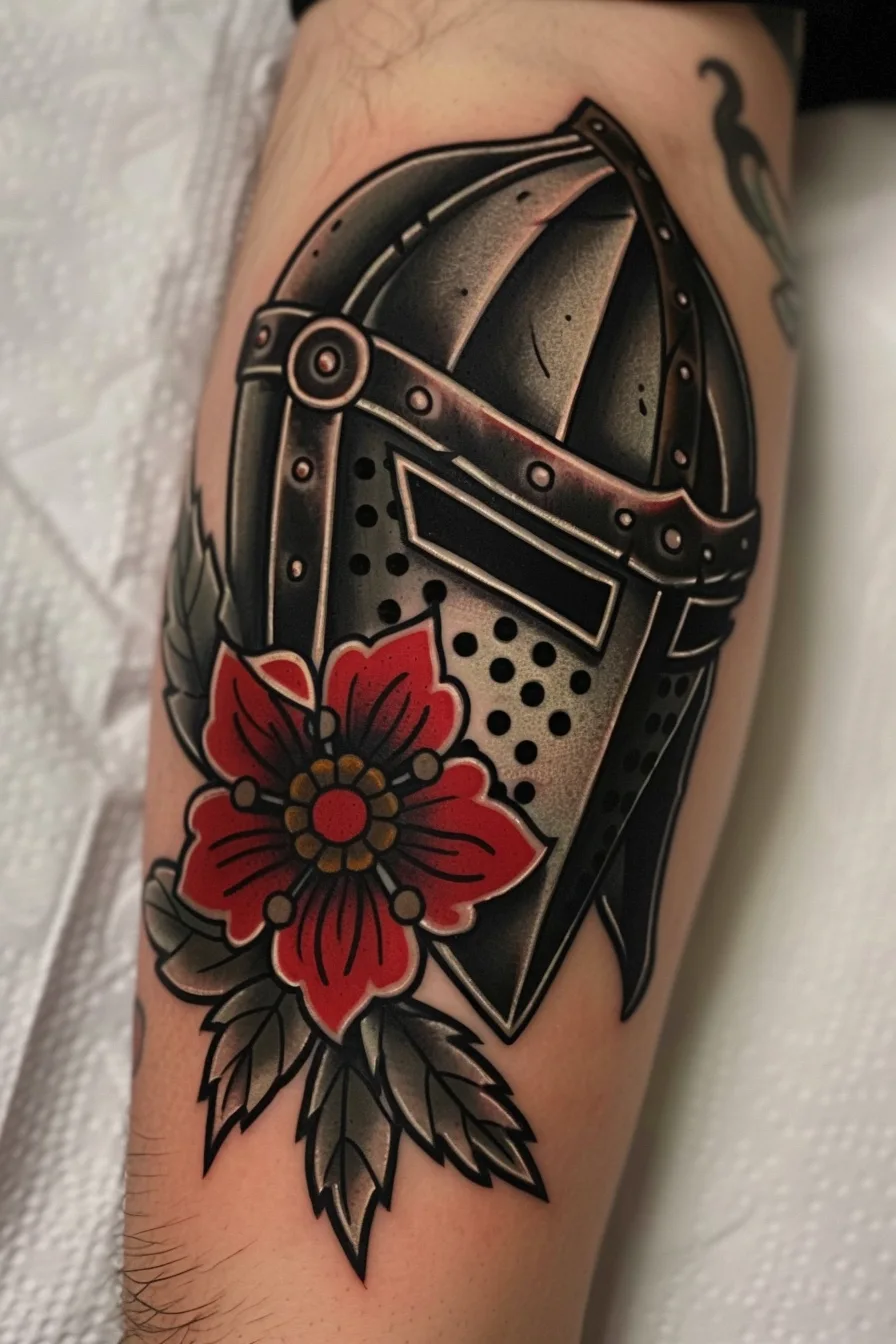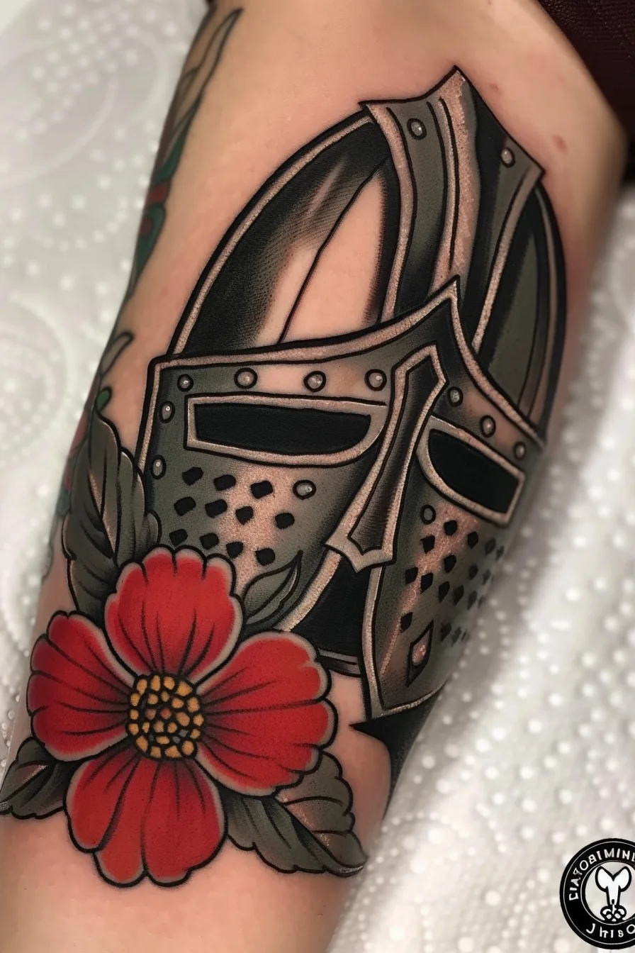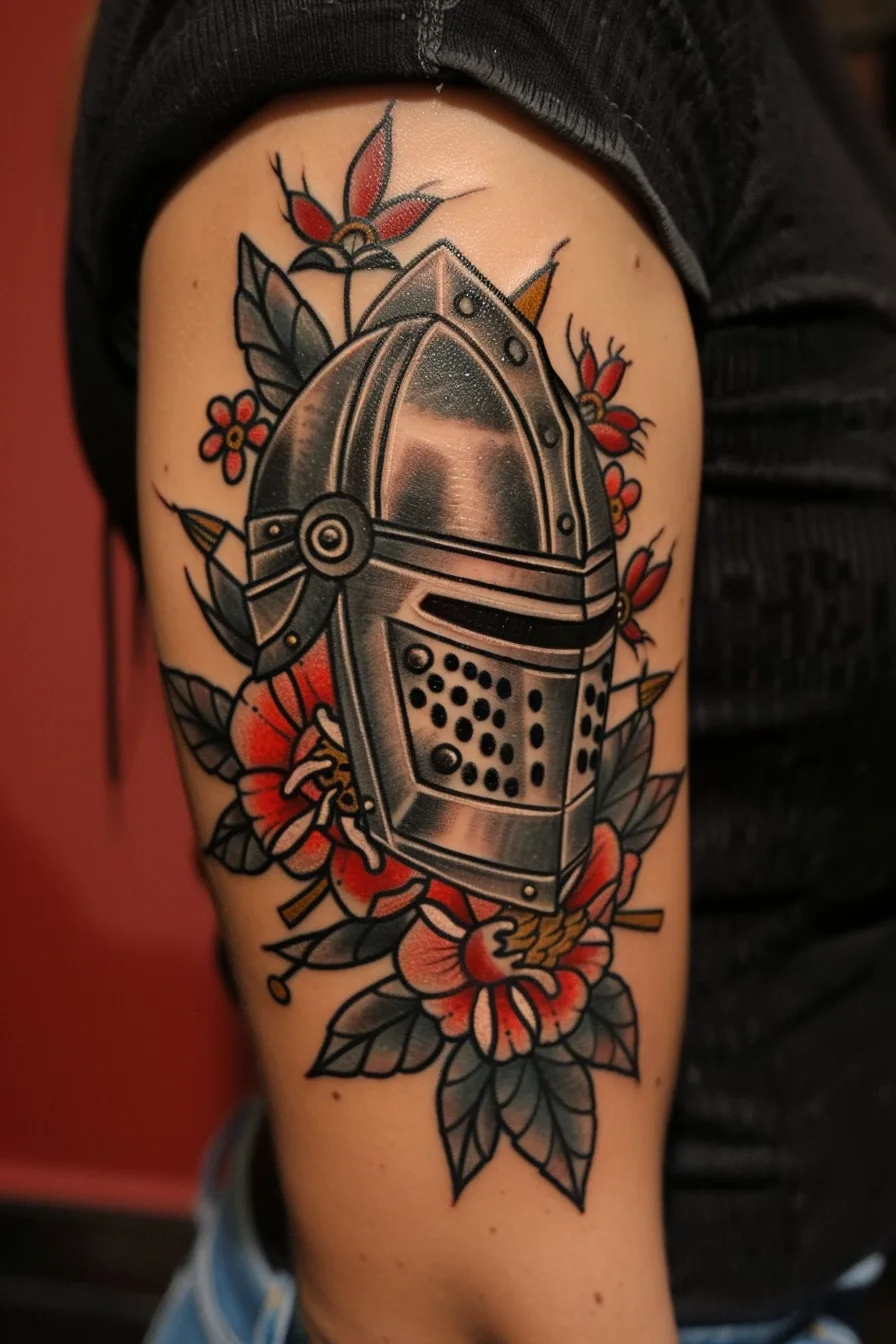 Whether you're considering a full-sleeve battle scene or a simple helmet silhouette, there's a knight tattoo to suit your style.