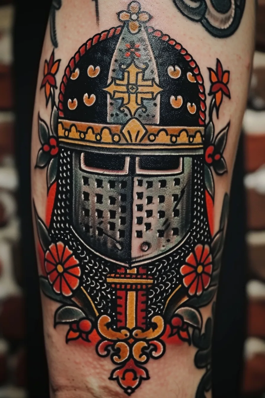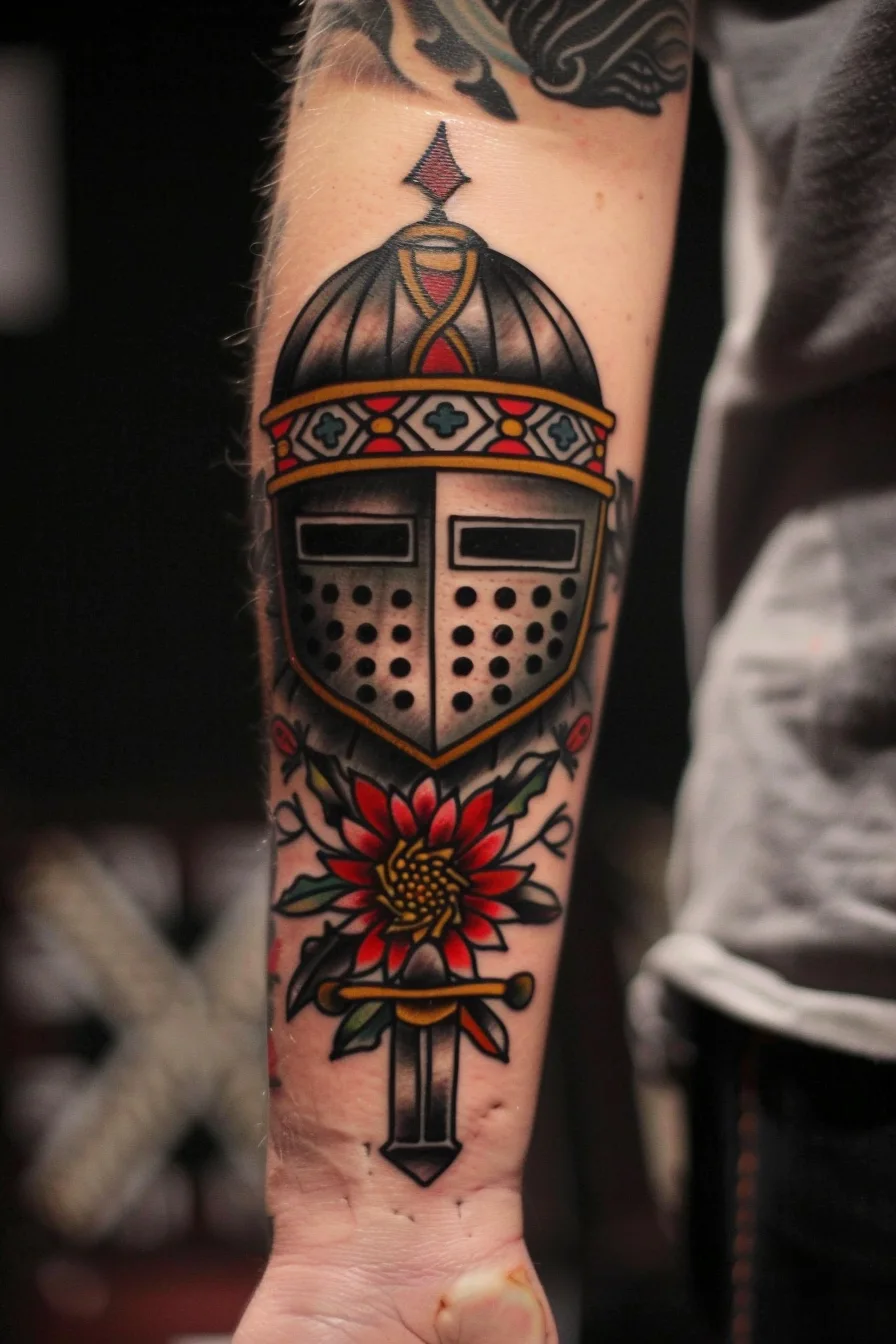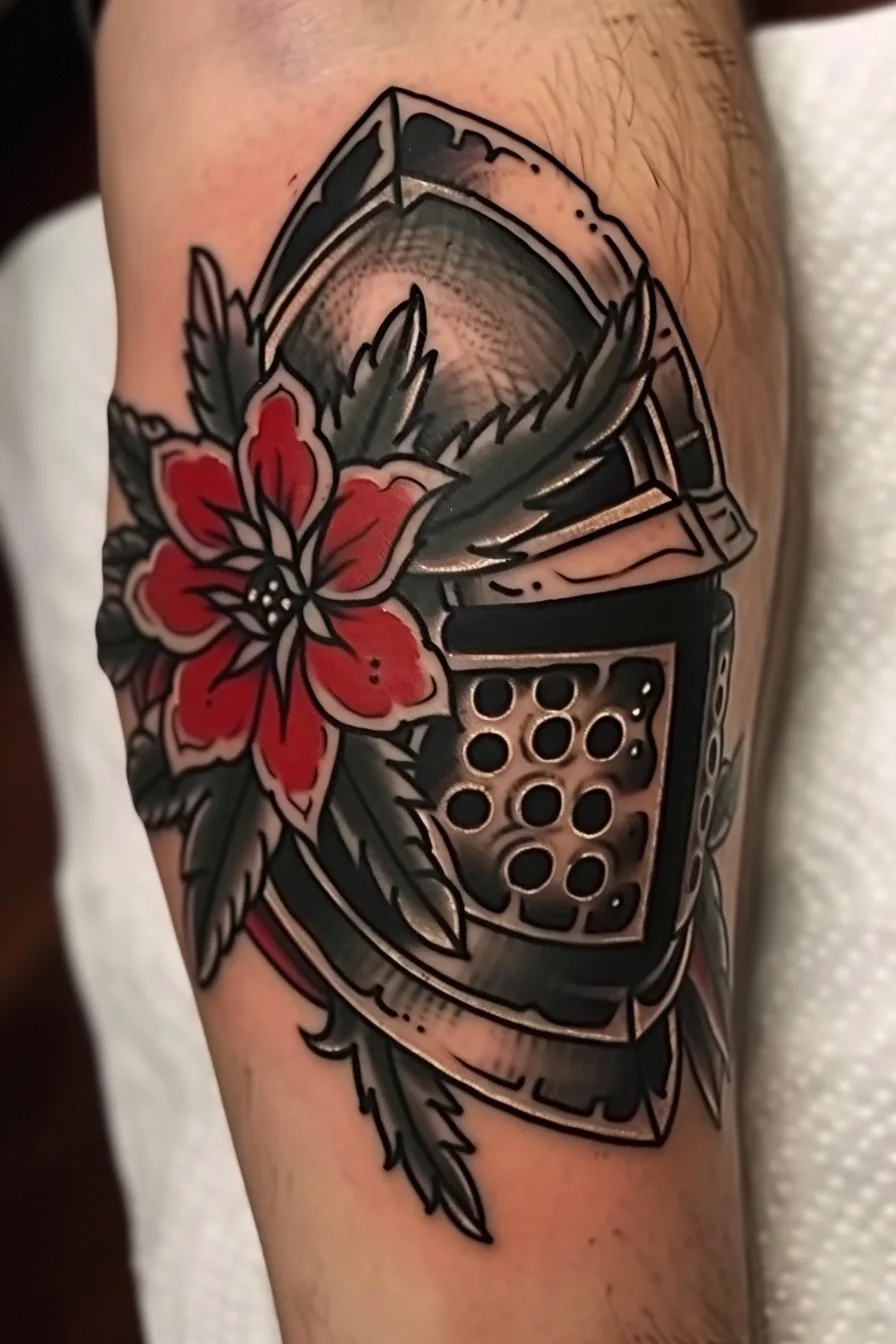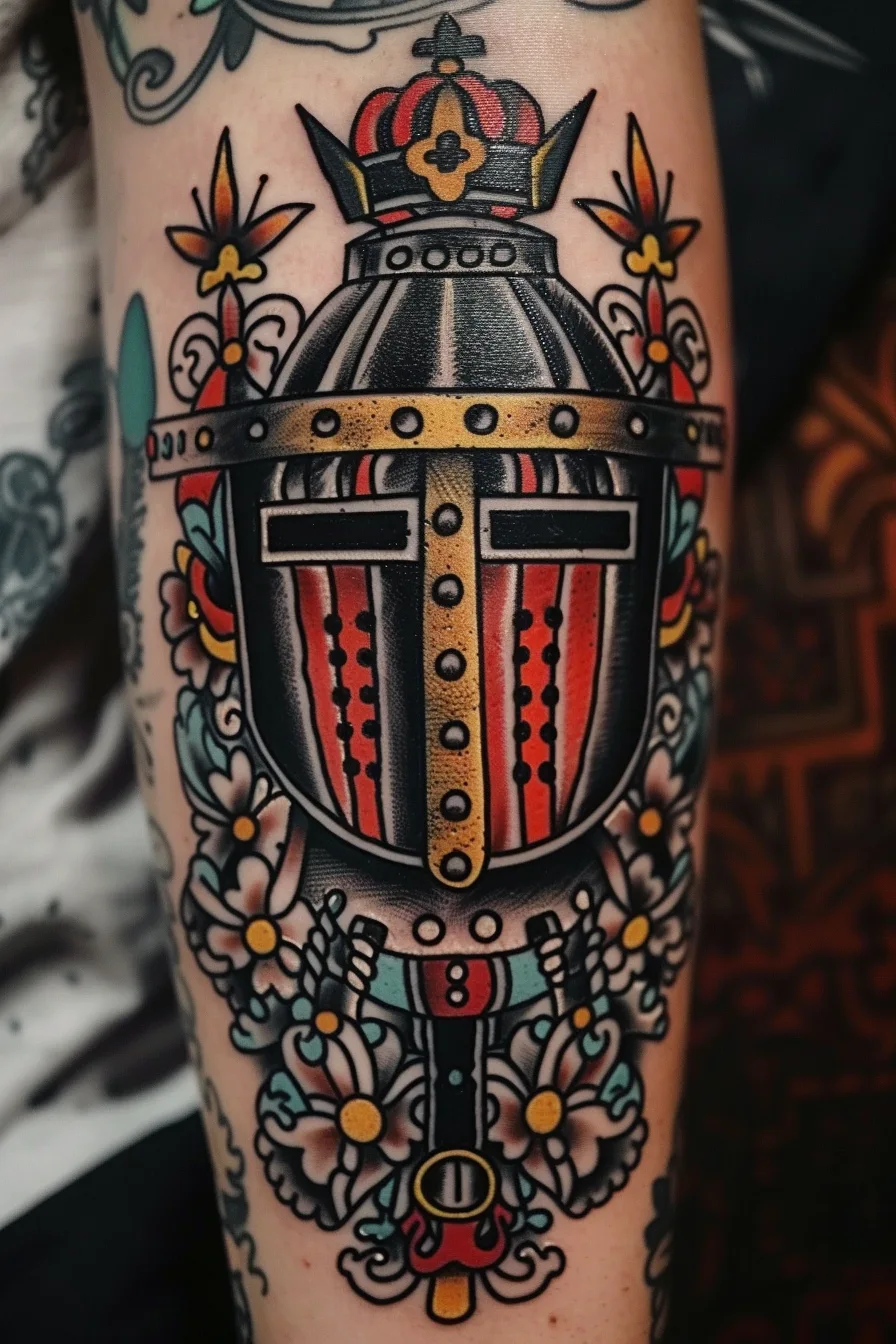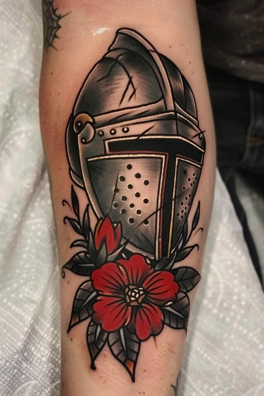 Whether you're considering a full-sleeve battle scene or a simple helmet silhouette, there's a knight tattoo to suit your style.