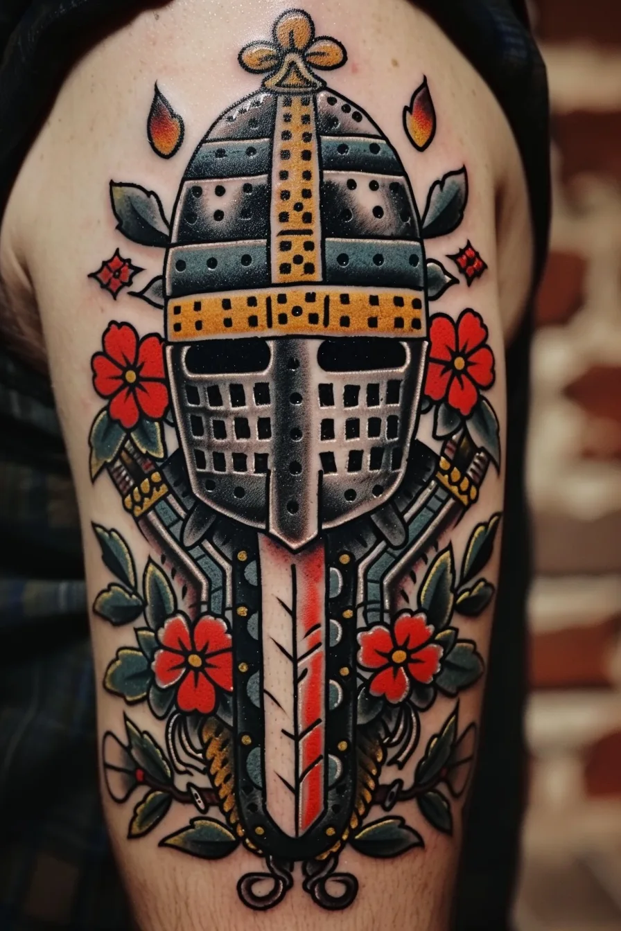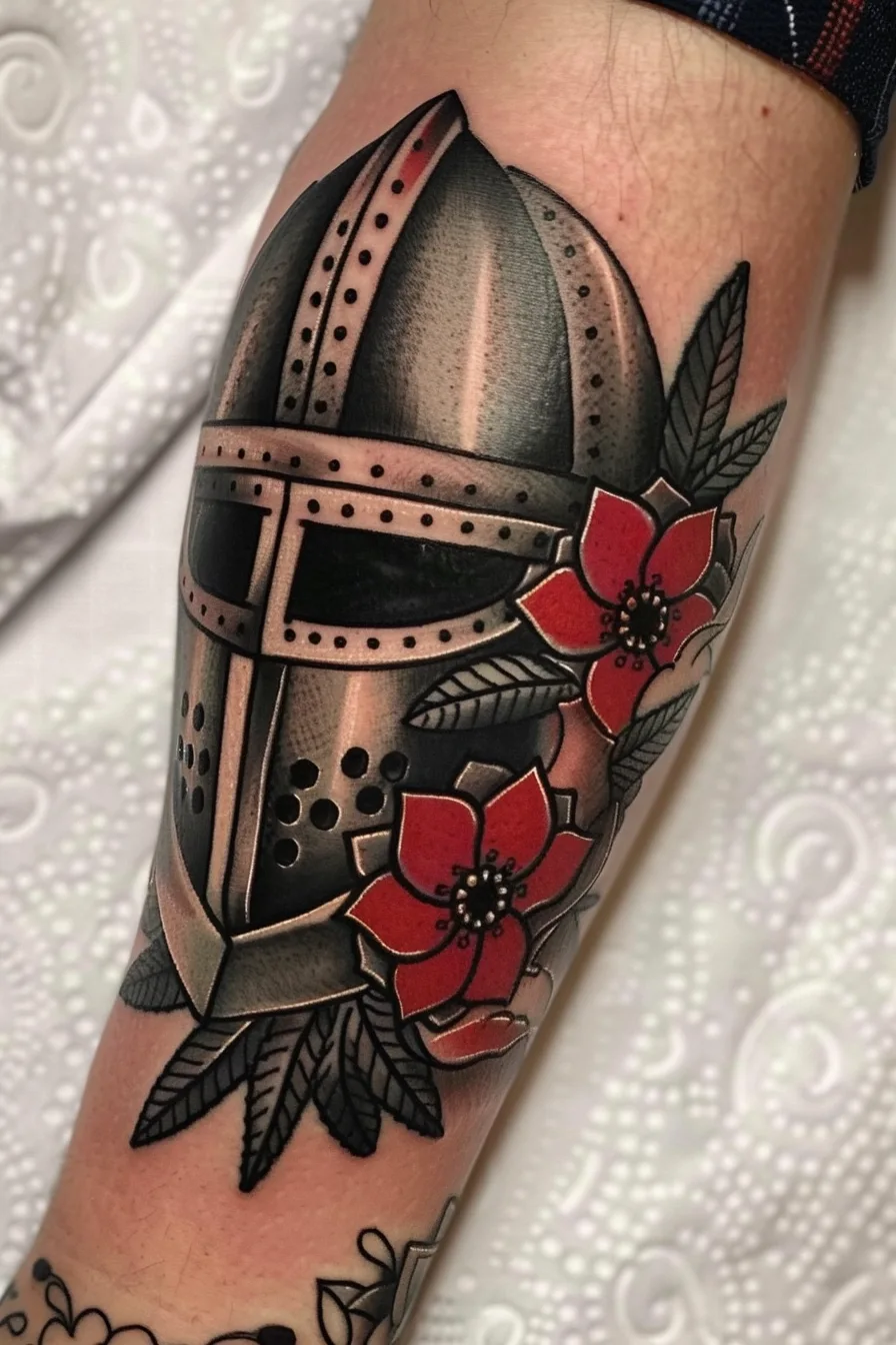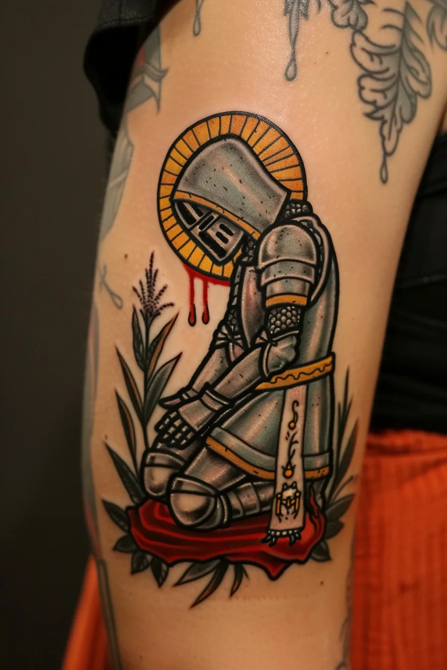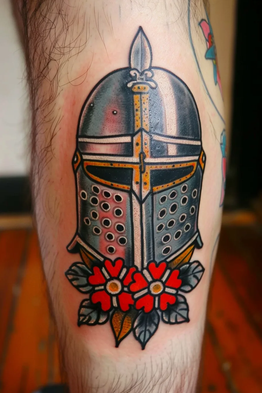 Whether you're considering a full-sleeve battle scene or a simple helmet silhouette, there's a knight tattoo to suit your style.