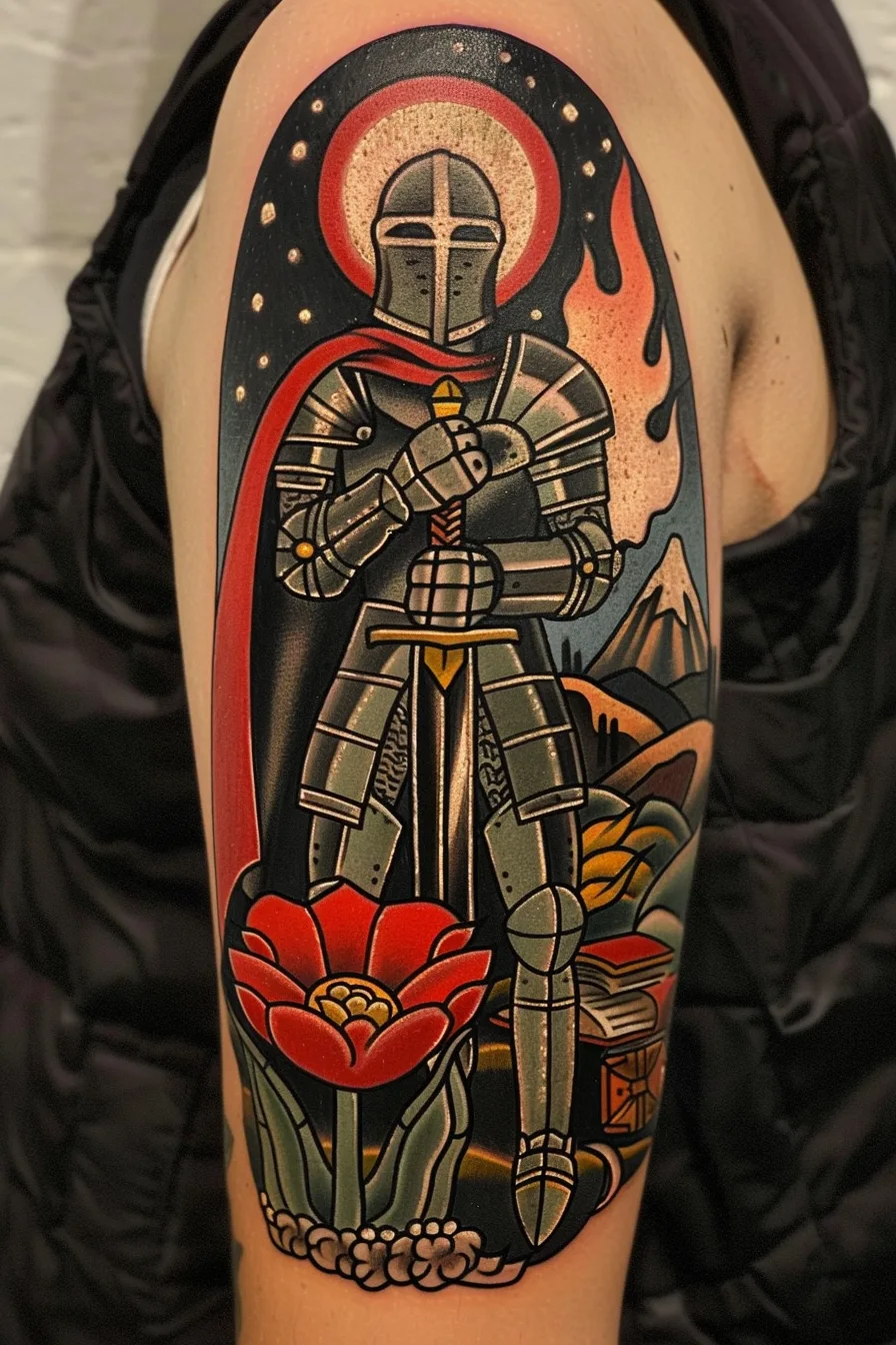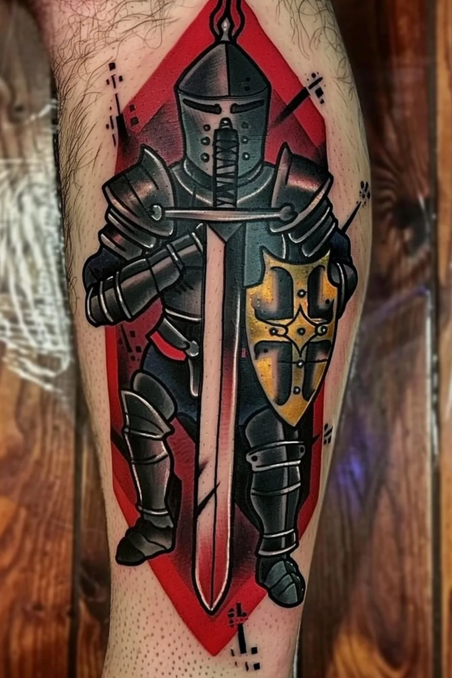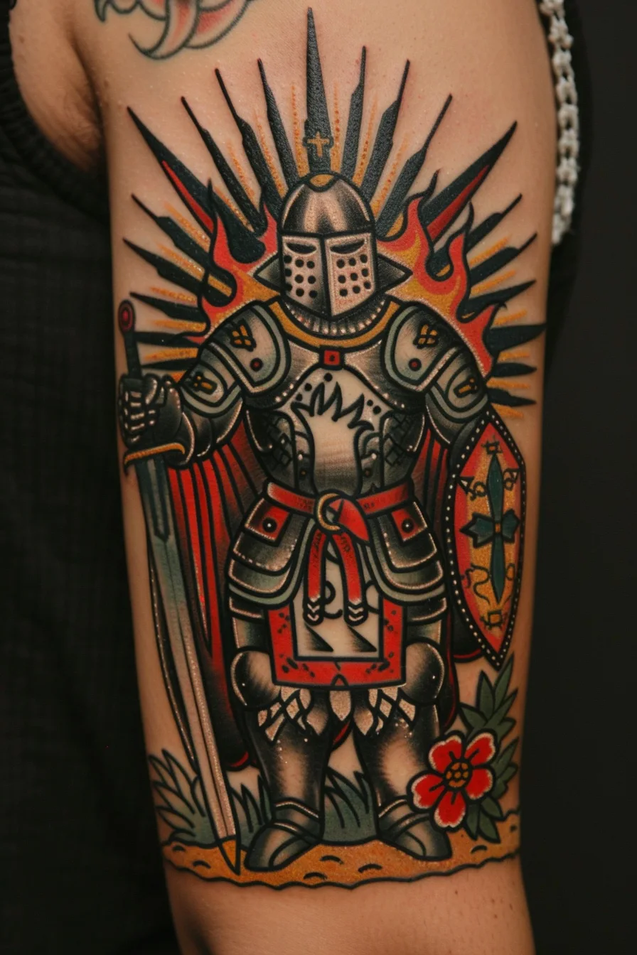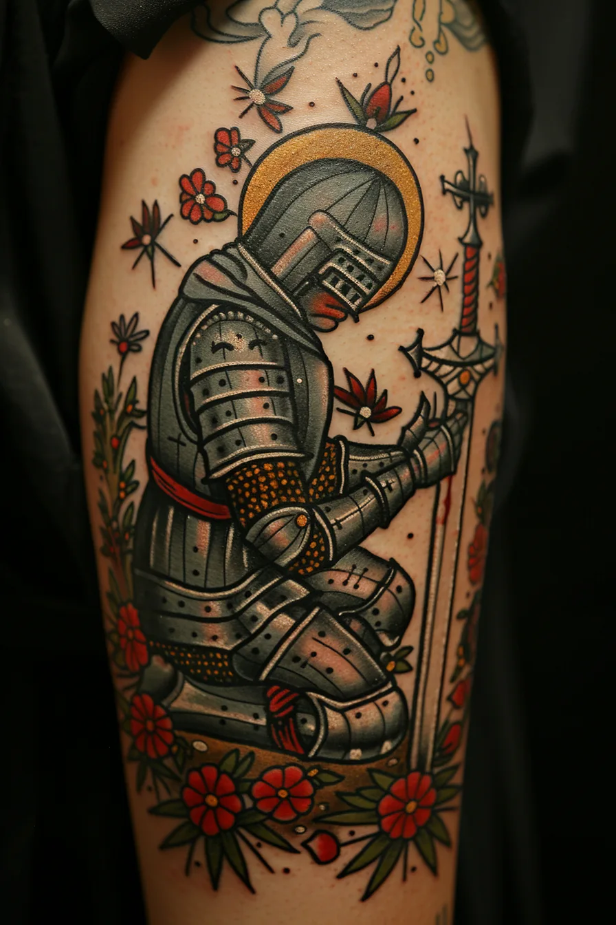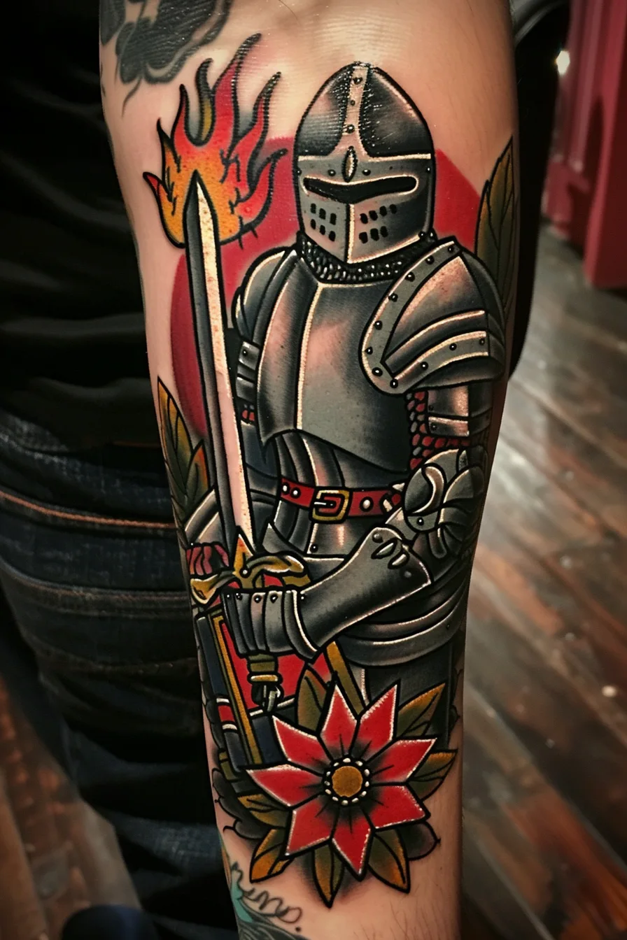 You've got to love traditional knight tattoos for their timeless appeal and deeper meaning.