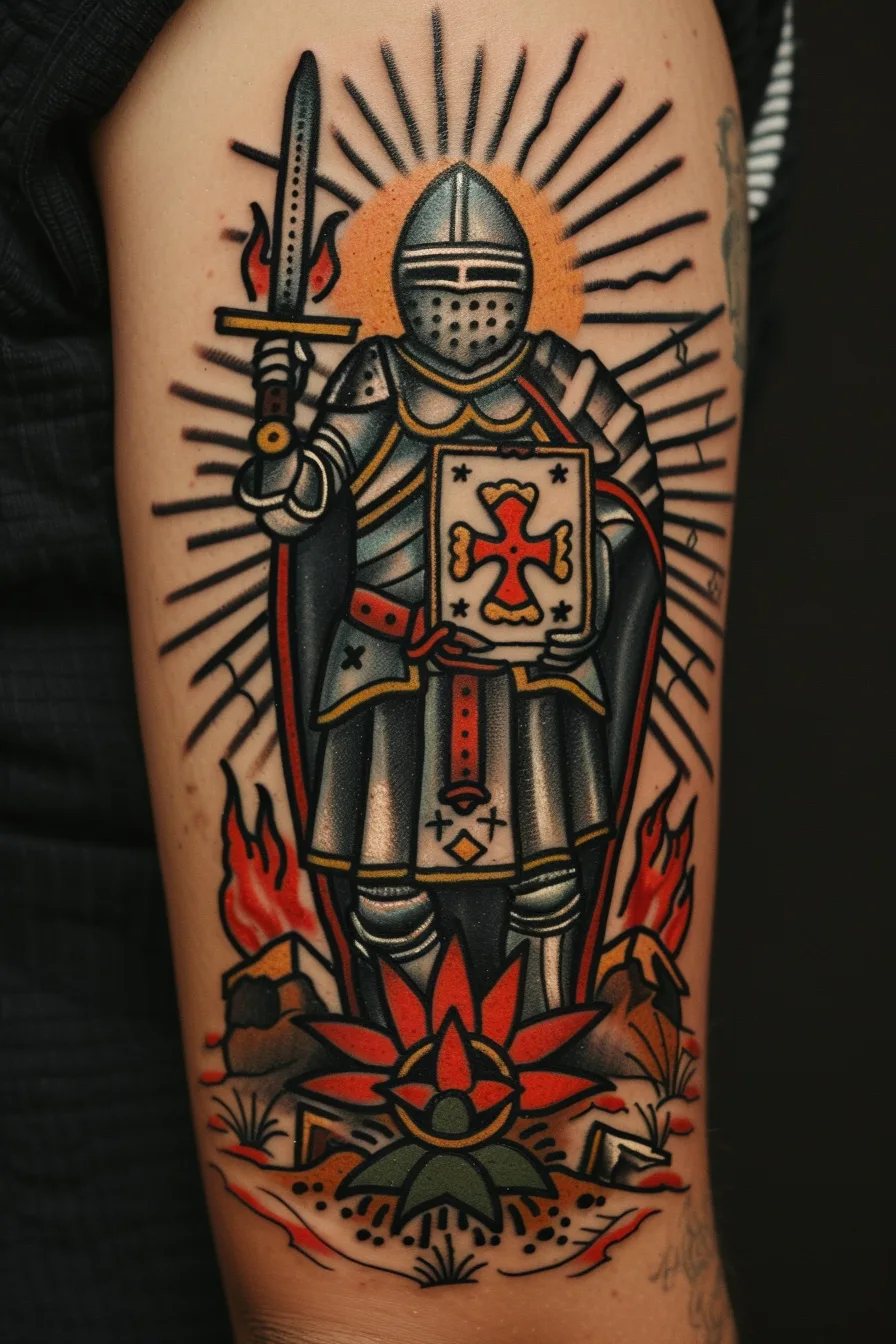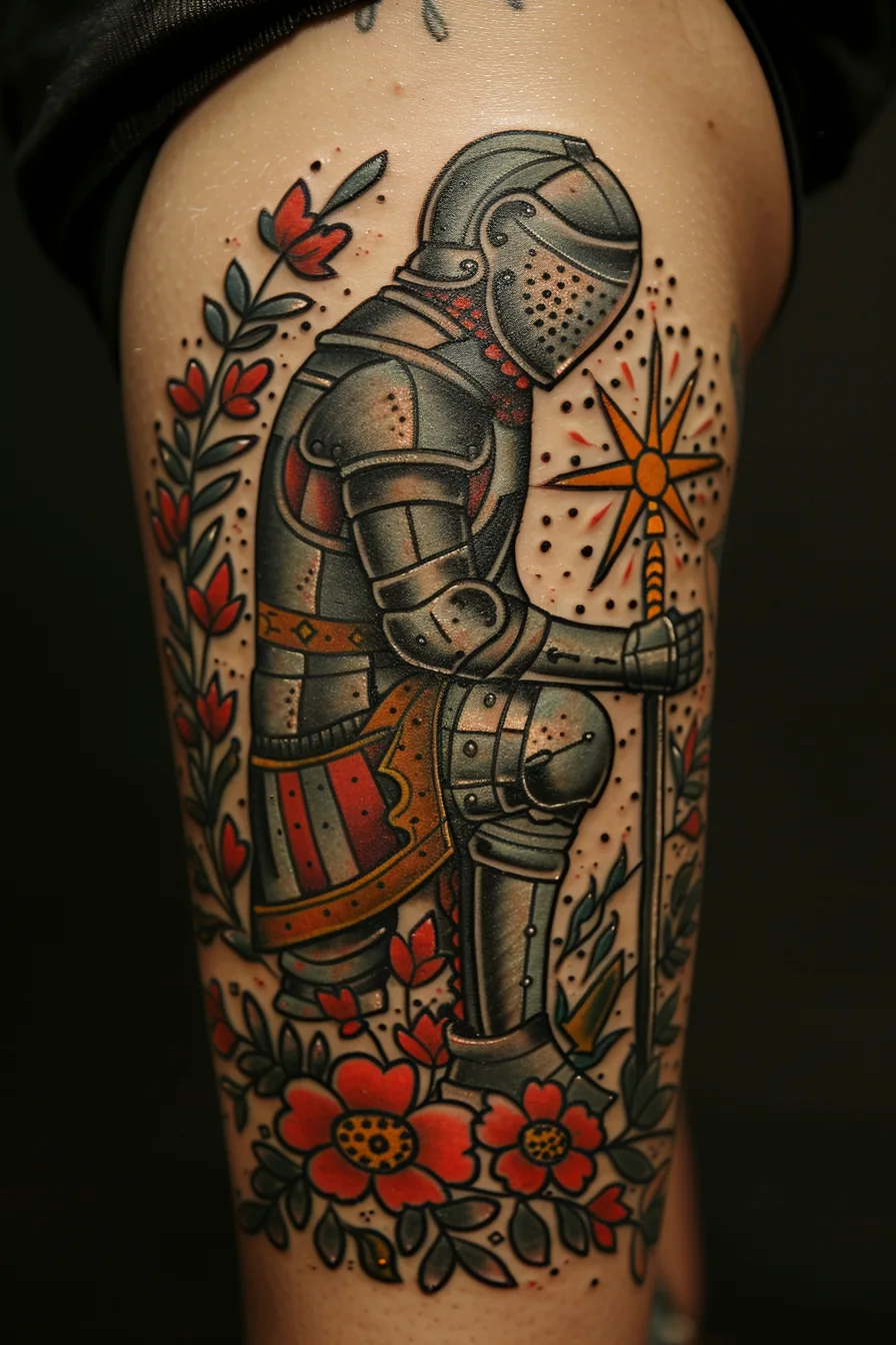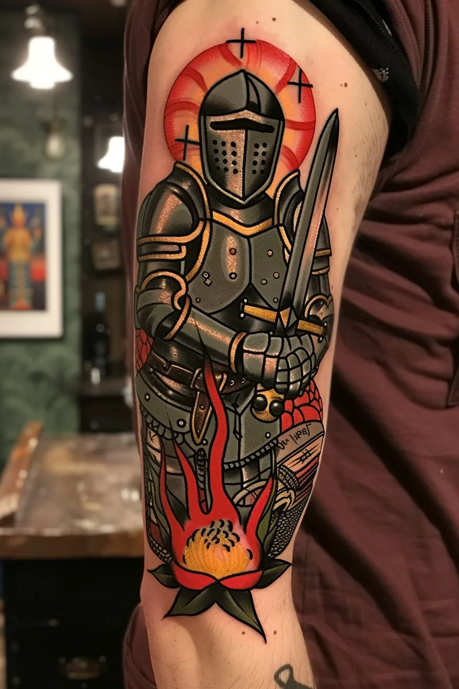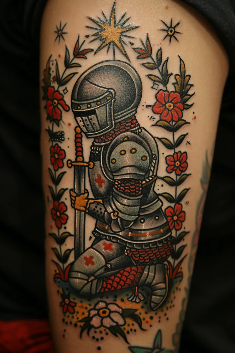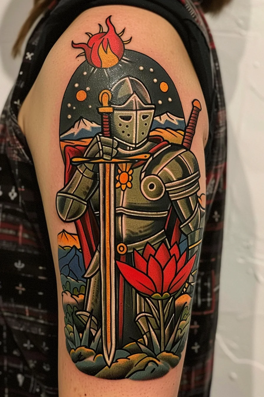 You've got to love traditional knight tattoos for their timeless appeal and deeper meaning.