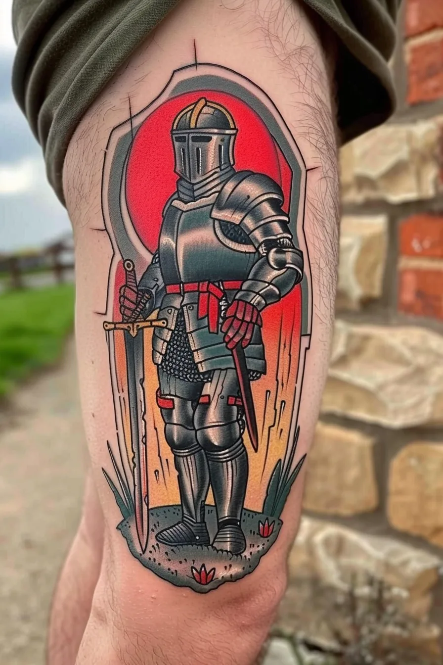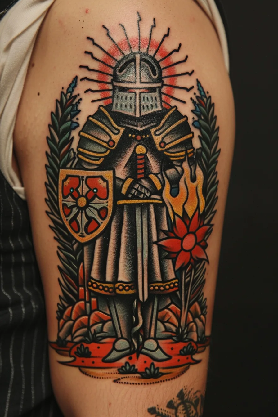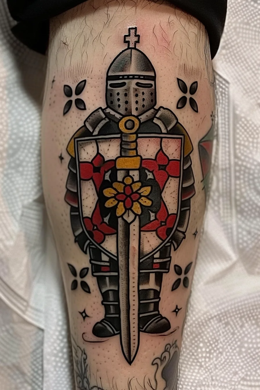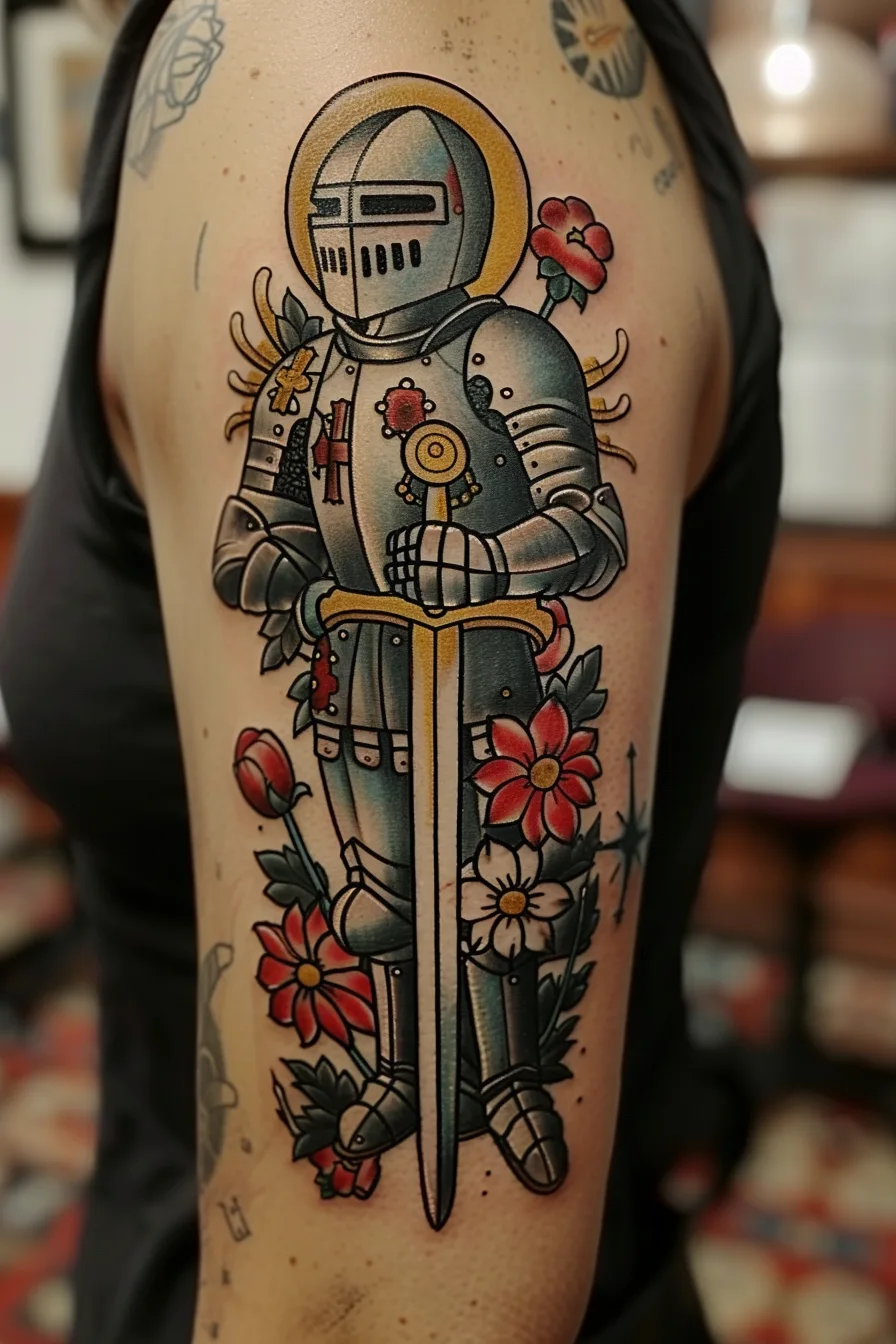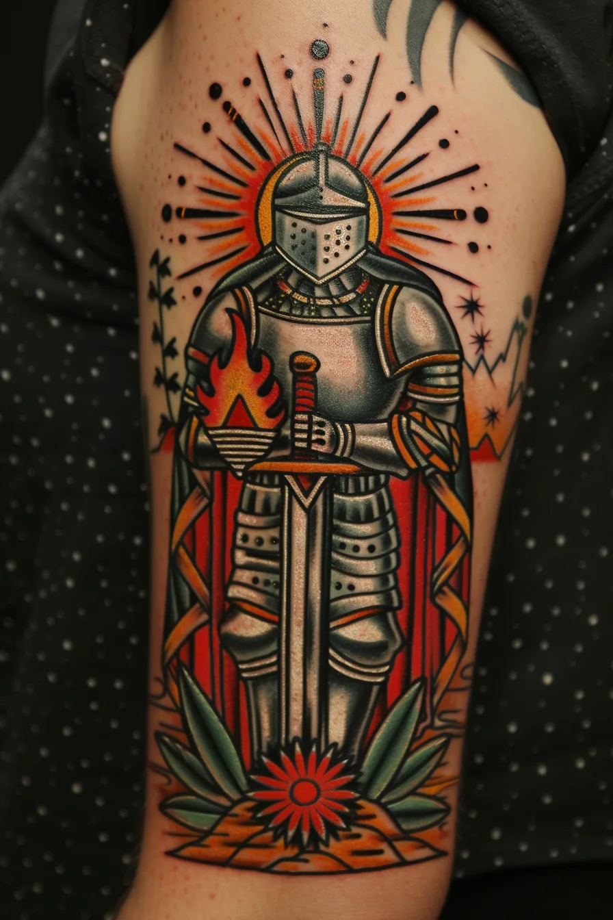 You've got to love traditional knight tattoos for their timeless appeal and deeper meaning.