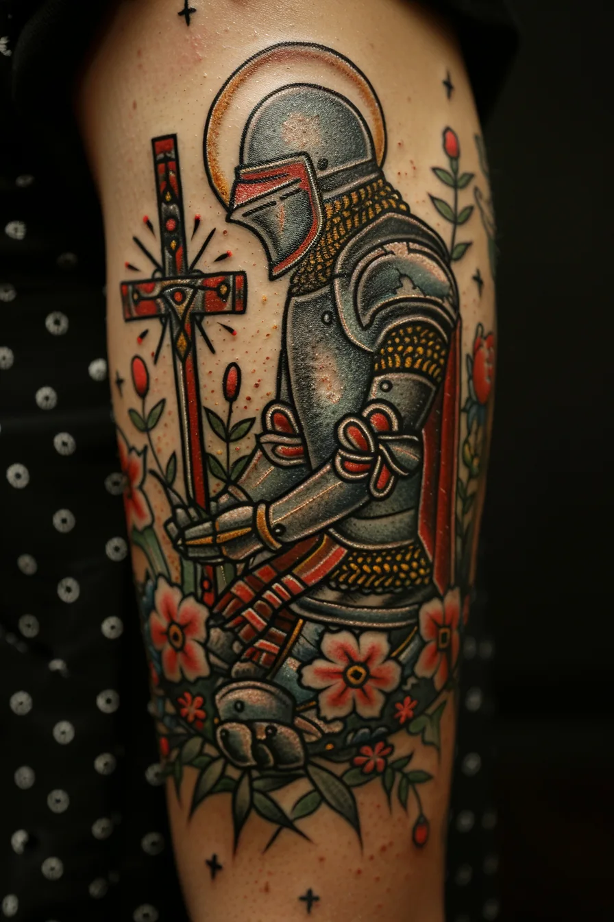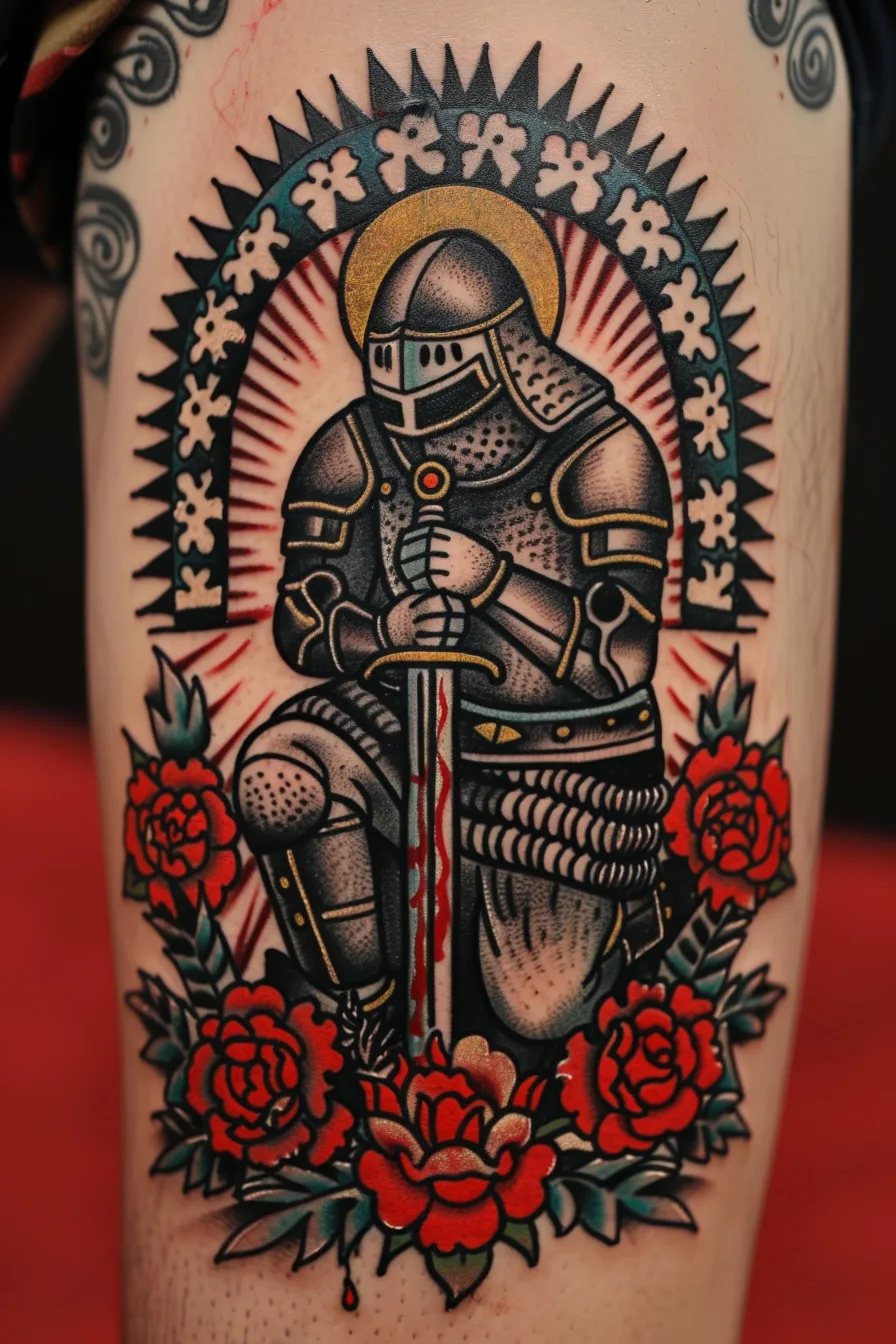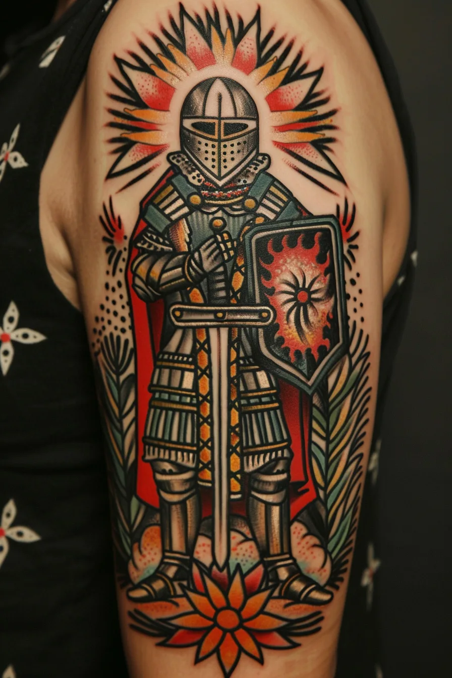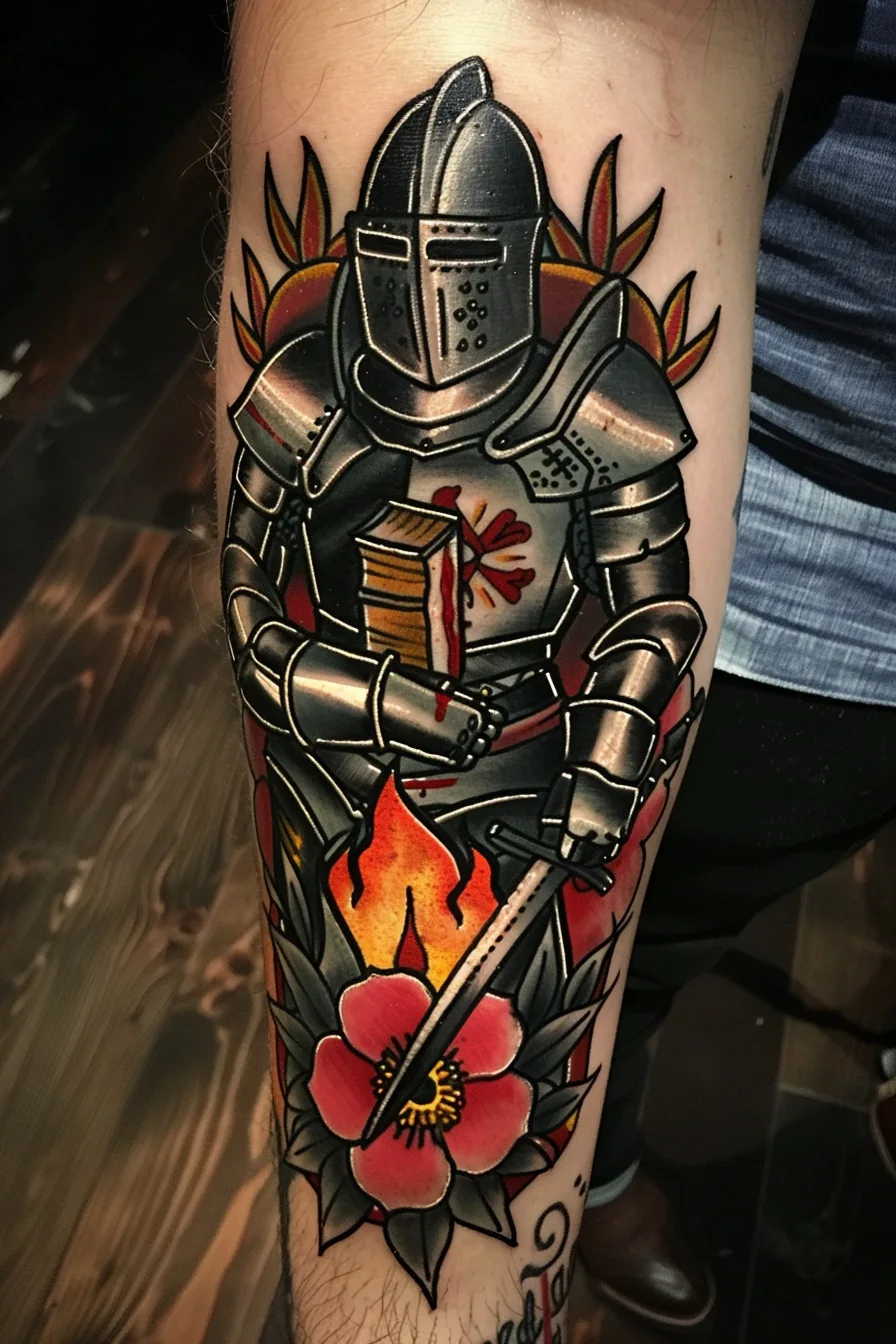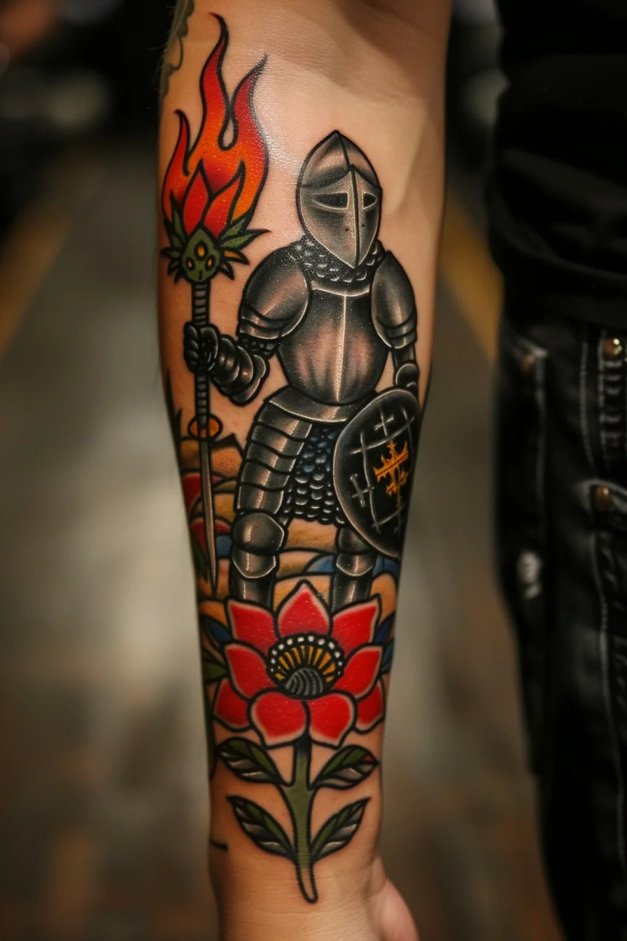 You've got to love traditional knight tattoos for their timeless appeal and deeper meaning.