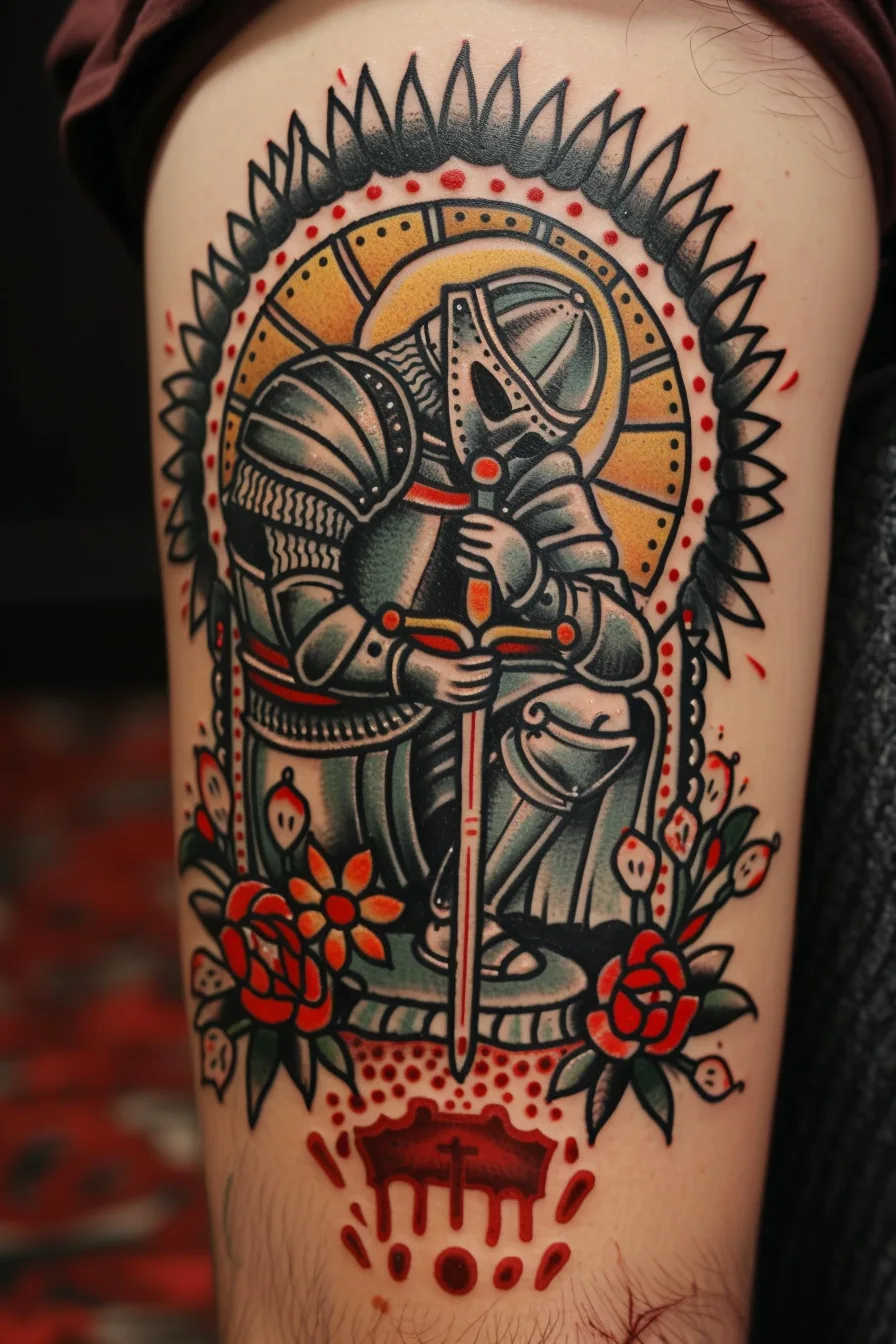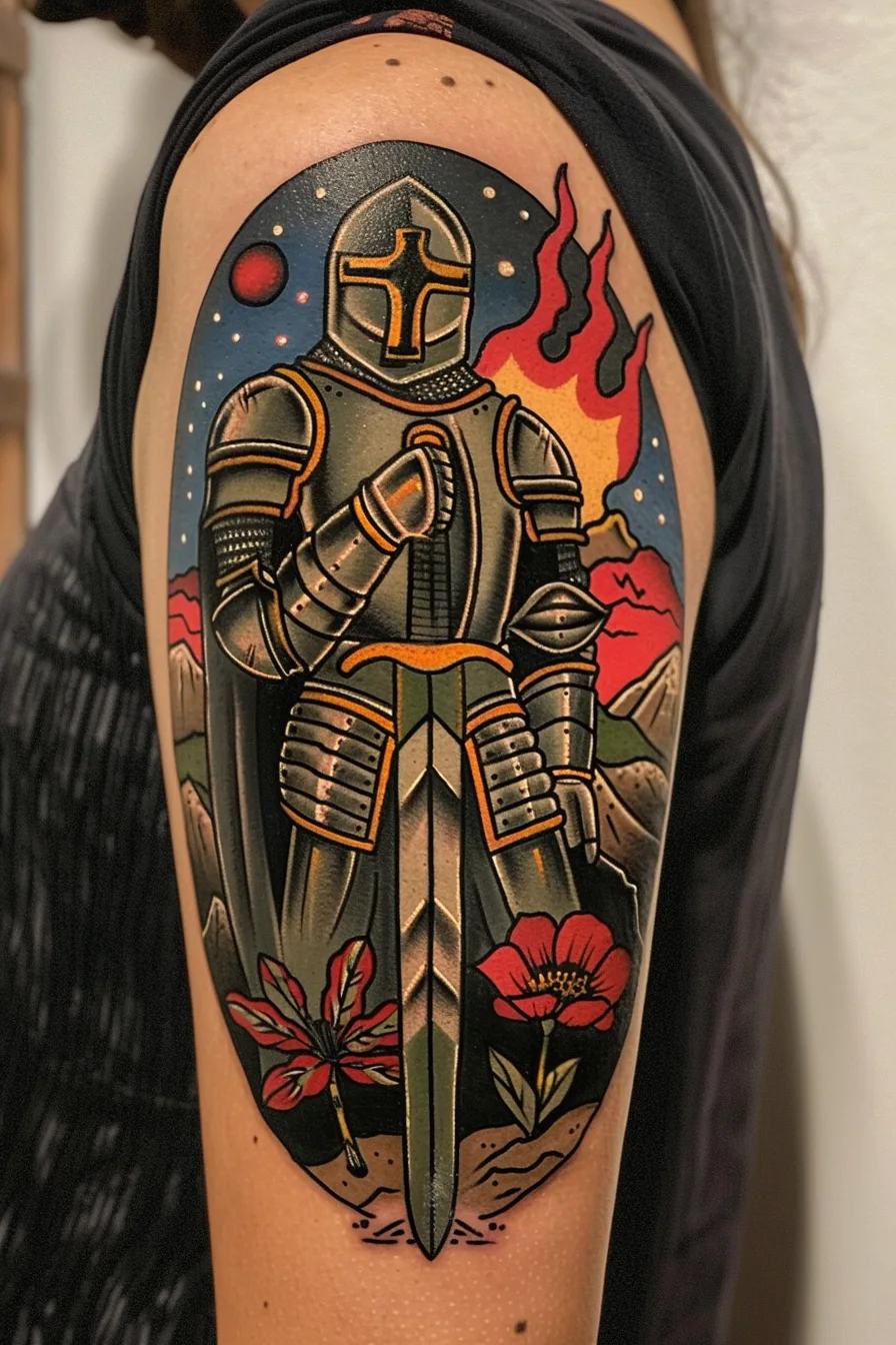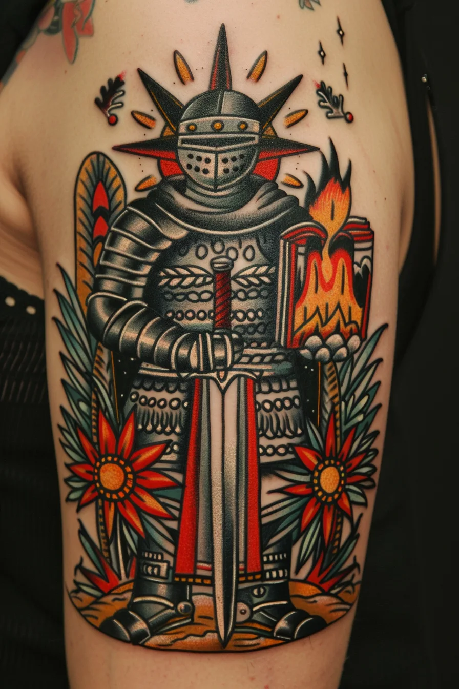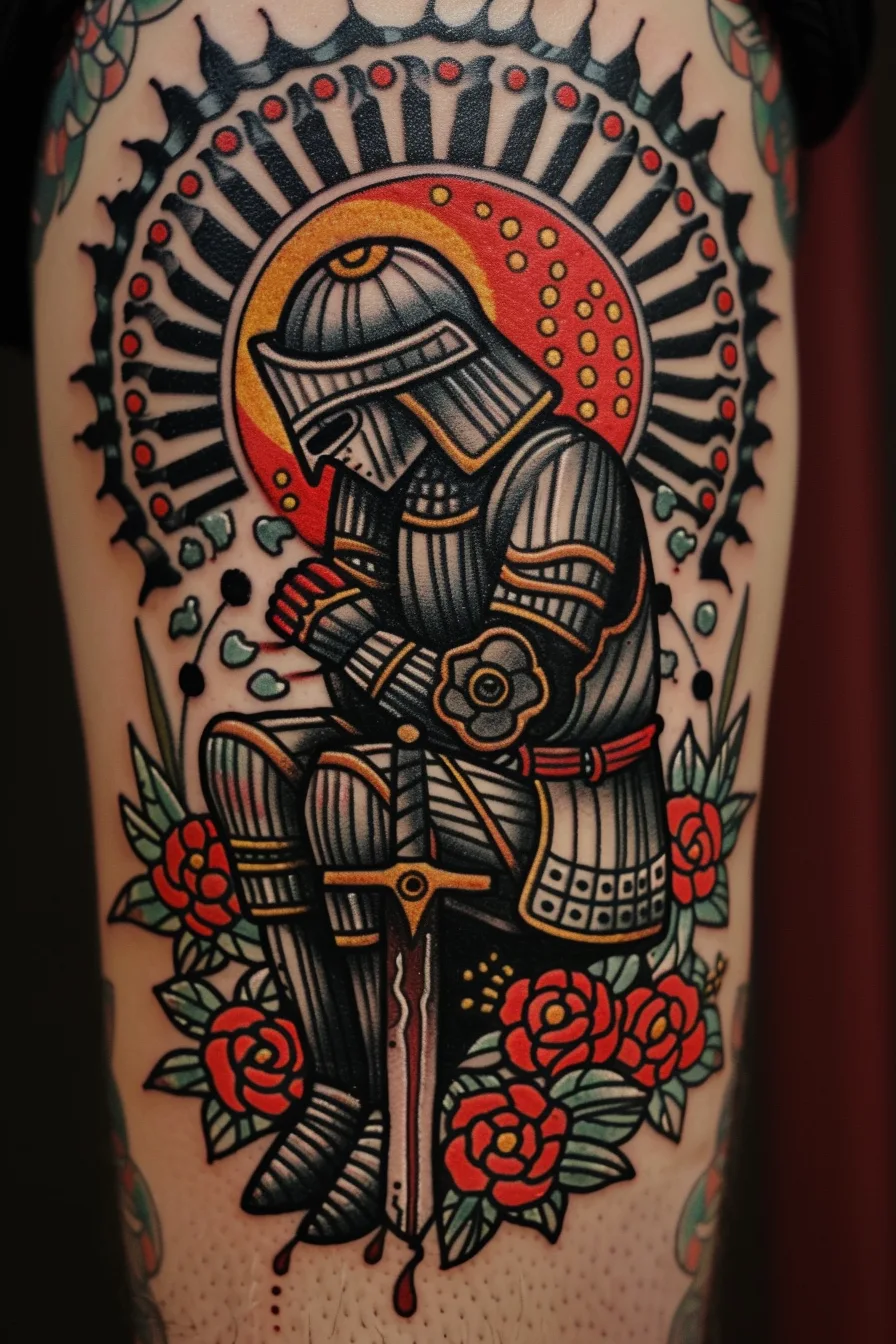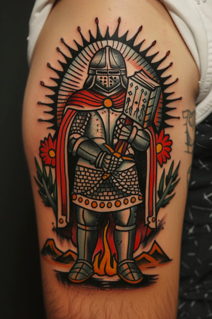 You've got to love traditional knight tattoos for their timeless appeal and deeper meaning.