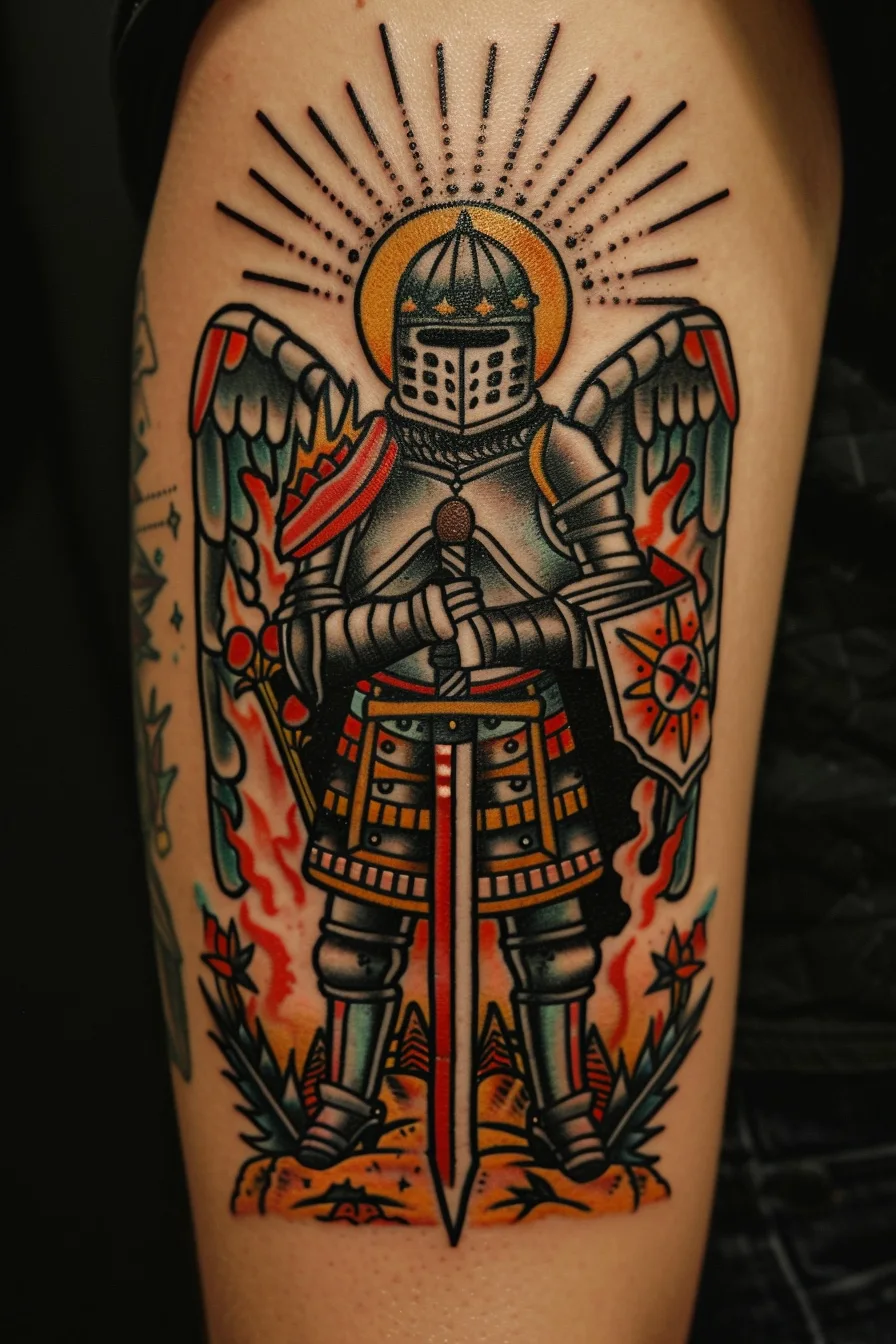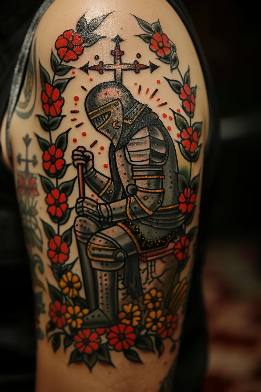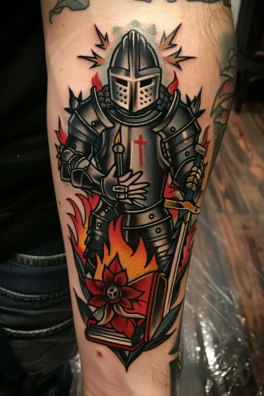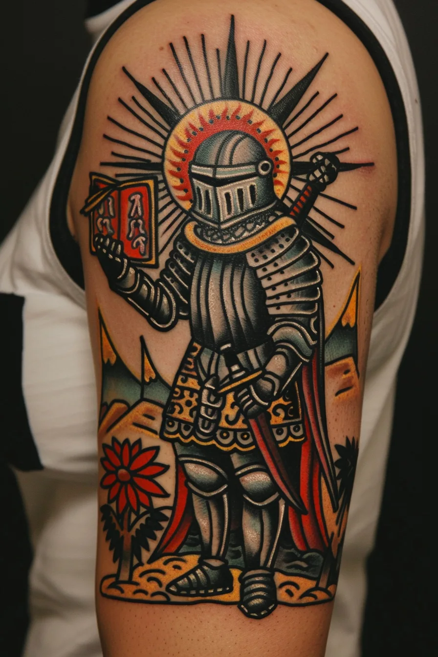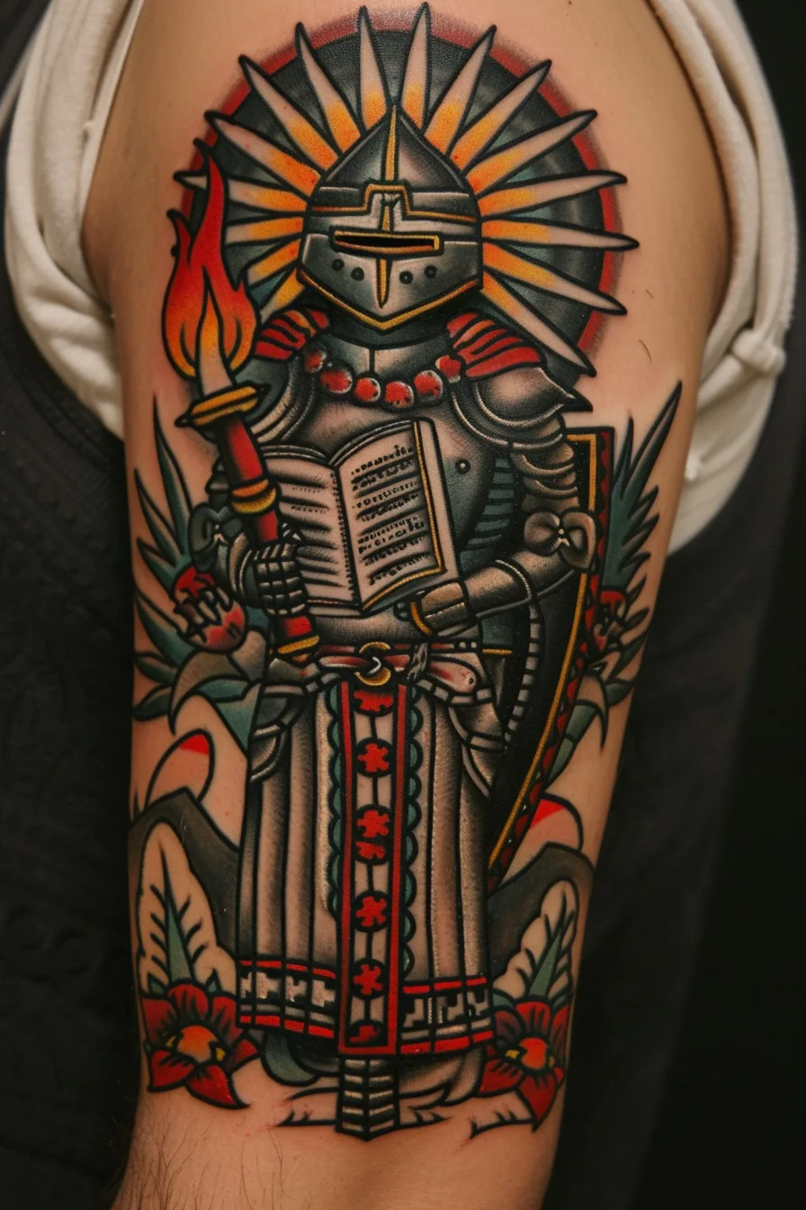 You've got to love traditional knight tattoos for their timeless appeal and deeper meaning.