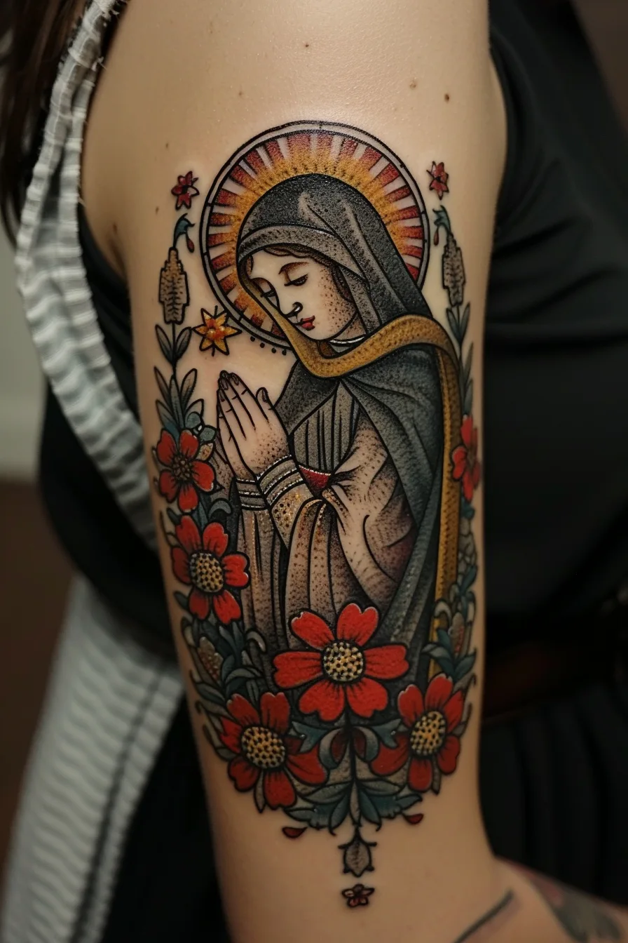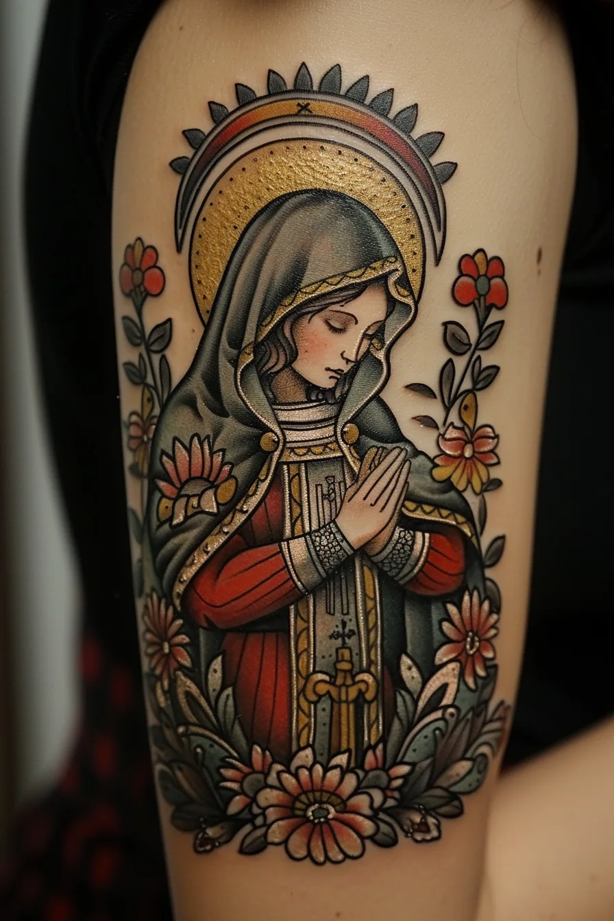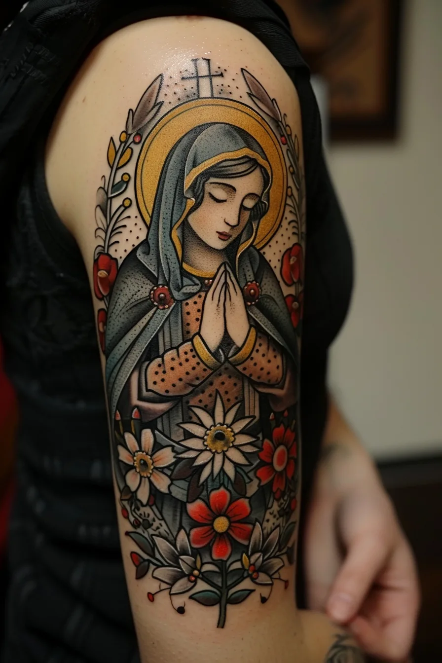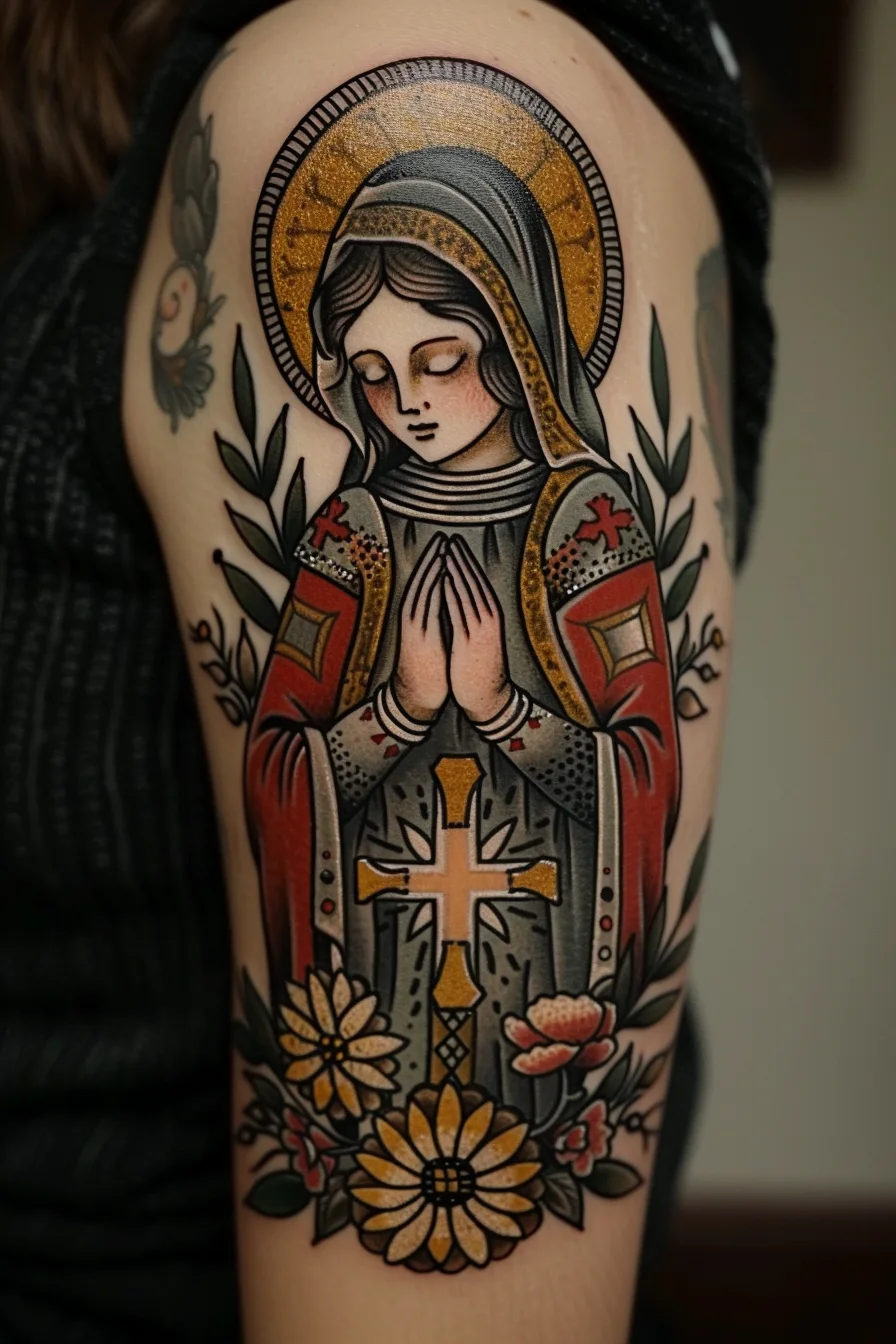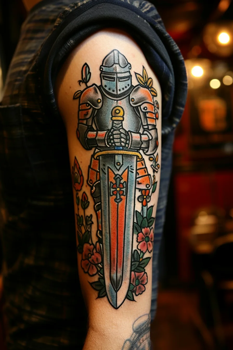The upper arm's bicep area offers a prime canvas for showcasing a bold, traditional knight tattoo design. It's like the sweet spot for showing off your inner warrior without going full medieval cosplay, you know?