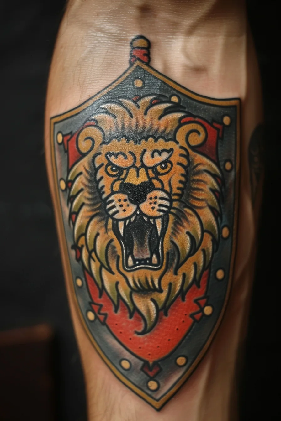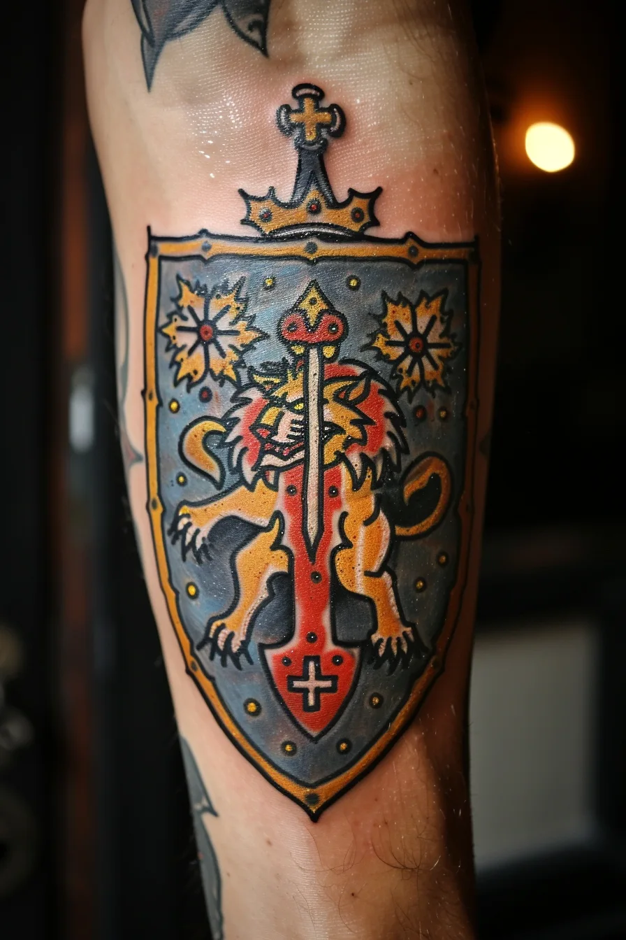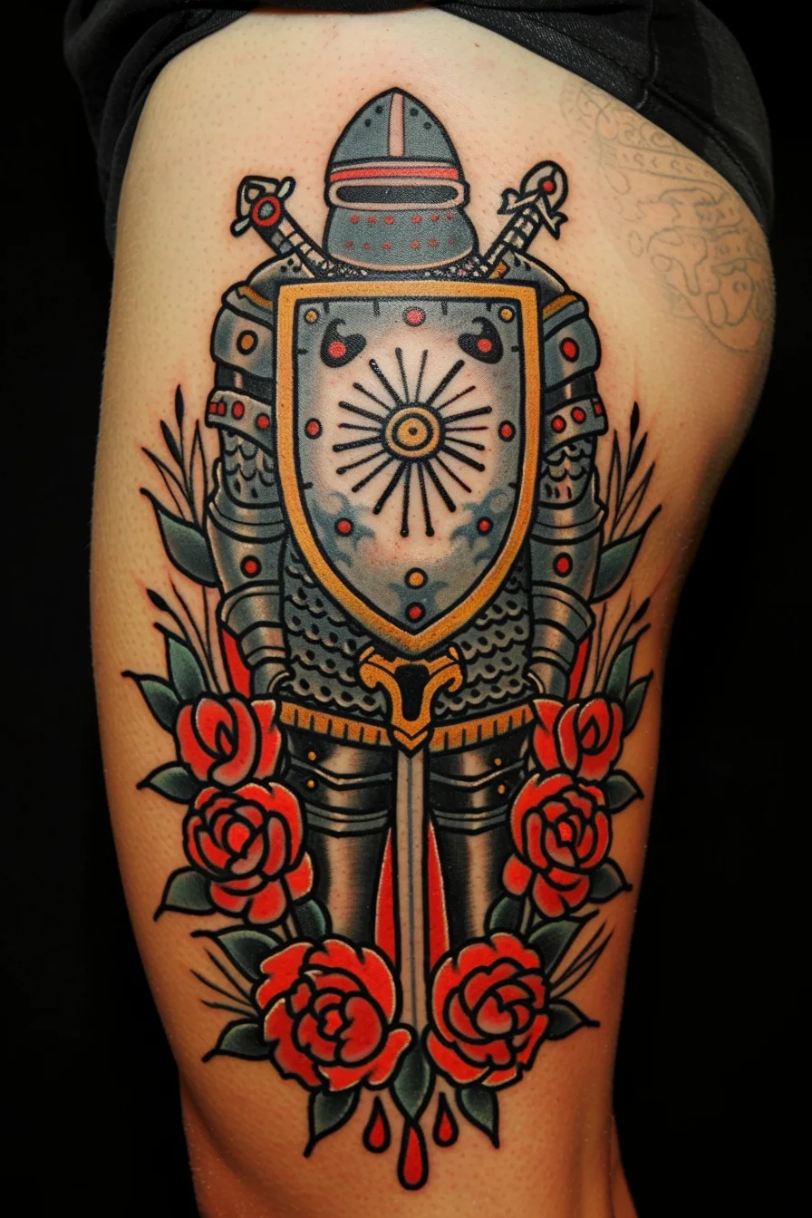 Color-wise, stick to traditional black and grey for that timeless appeal. Or, if you're feeling bold, throw in some red for a pop of drama. Just remember, unlike real armor, this ink is permanent. So choose wisely, future Sir Lancelot – your skin canvas awaits its noble design!