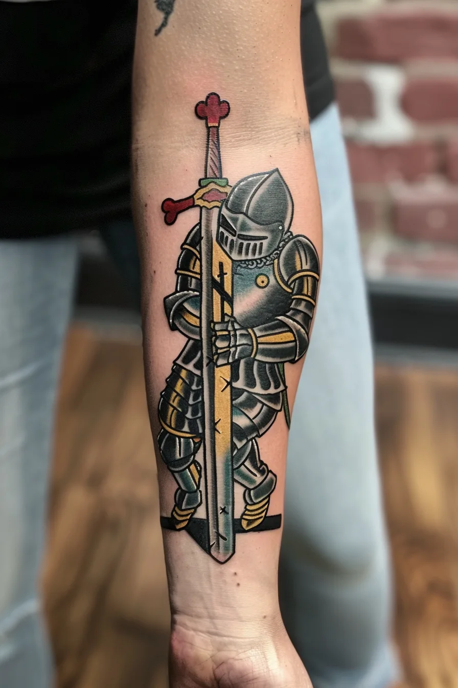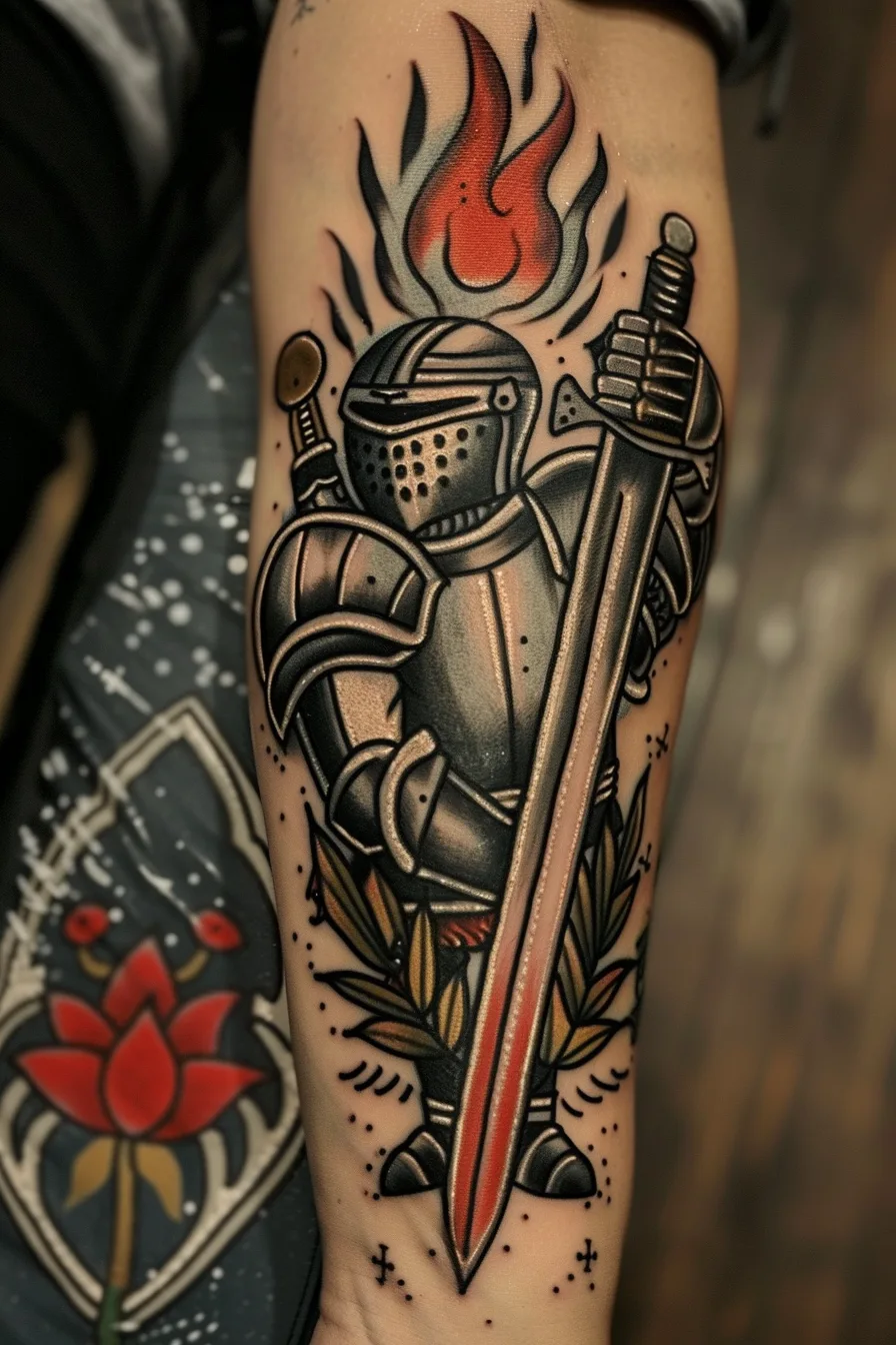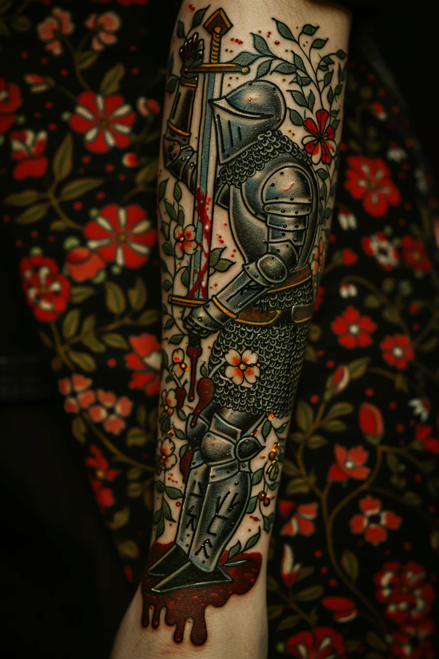 If you're looking to make a bold statement with your medieval-inspired ink, a forearm sleeve knight tattoo might be right up your alley. This placement is perfect for showcasing intricate details of armor, weapons, and heroic poses. Plus, it's like having your own personal bodyguard on display 24/7!